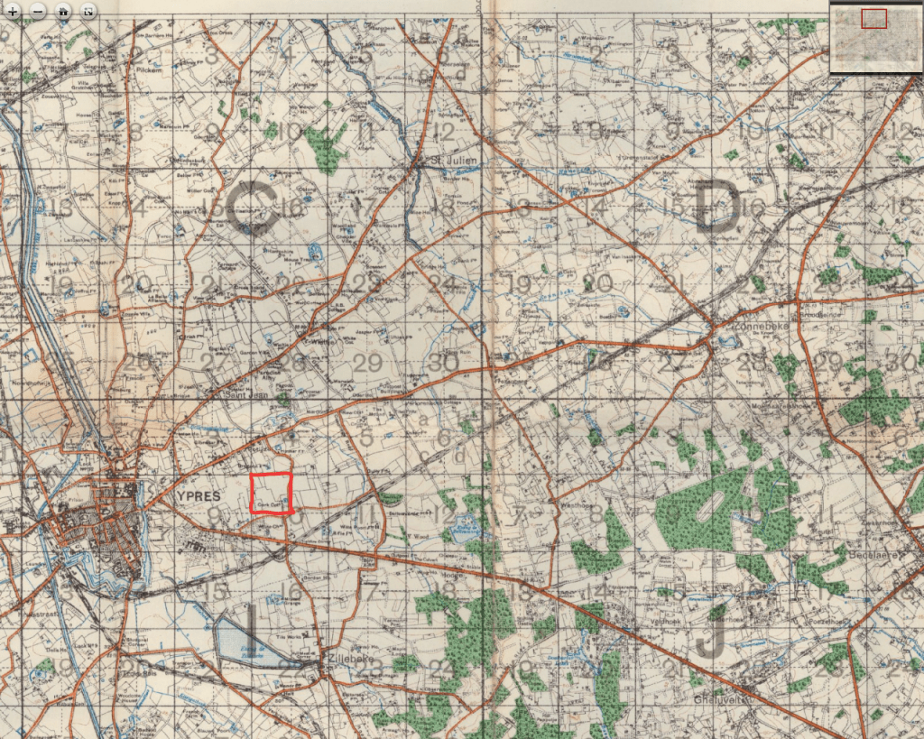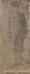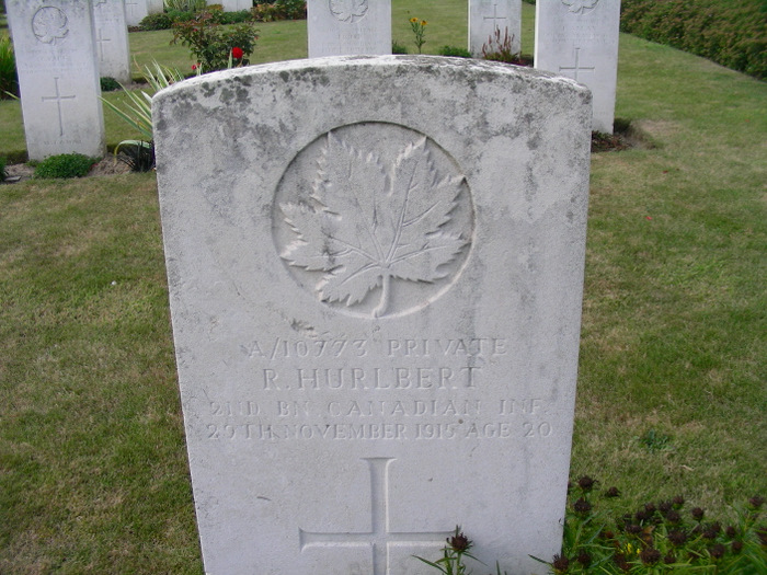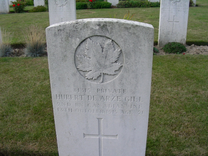 Meanwhile Hector was off to France. After transferring to the 14th Battalion (the 12th, his original assignment, was retained in England as a reserve battalion), he sailed for the front at the end of February 1915. The Canadians were brigaded with British units to learn the ropes and helped with the fighting at Neuve-Chapelle in those early days. But as April progressed and the Germans secretly laid plans to release chlorine gas at Ypres, the Canadian battalions found themselves posed to take a huge role in the defense of the Ypres Salient. As the apex of the Salient collapsed inward on 22 April 1915, the result of the first large scale, successful gas attack of the war, Canadian battalions were thrown into the fire, including Hector and the 14th Battalion. On the morning of 23 April 1915, less than 12 hours after the initial gas attack, the 14th occupied positions near St. Julien. There, they faced renewed German advances, and as the firing began, Hector’s luck ran out. According to a letter from Sergeant L.E. Locke to Captain and Mrs. Cameron, Hector was hit in the head and died instantly. Whether this was the truth, or just what seemed the best thing to say to ease his parent’s grief is unknown.
