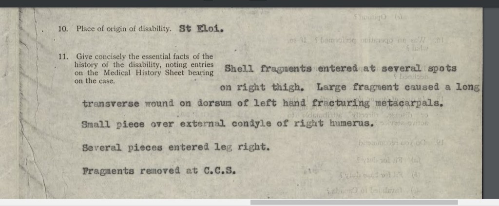 Blighty was the nickname British troops had for England, and a “Blighty” injury meant a trip across the channel for an extended stay in the comfort of a hospital far from the fighting. These were injuries too serious to mean a quick turn-around back into the fighting, but not serious enough that evacuation risked killing the patient. In Jack’s case, he sustained a gunshot wound to his right knee, his left arm above the elbow and a devastating shrapnel wound across the back of his left hand, shattering the bones. From the No. 11 General Hospital near Boulogne, Jack travelled to Folkestone, then the Bearwood Canadian Convalescent Hospital in Wokingham, and finally the Granville Canadian Special Hospital in Ramsgate. As the months wore on, it became clear that Jack would never regain much use of his left hand. Repeated infection – for which there were no antibiotics – in both his hand and elbow meant operations and procedures to clear infected tissue and which left draining holes. By December of 1916, Jack was sent home to Canada, no longer fit for active service. Convalescing in Halifax for much of 1917, Jack finally made it home that August and was formally discharged on 31 January 1918.