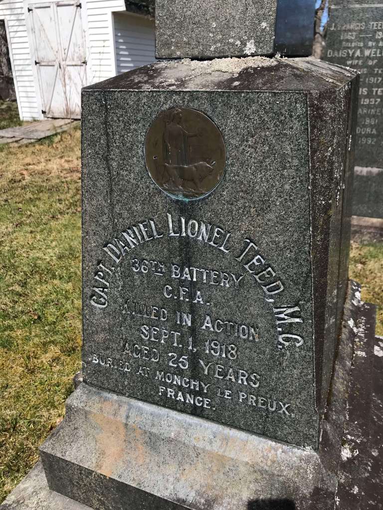 Will had missed the big show on Easter weekend due to coming down with mumps but he was soon back with a drastically altered battalion – some of his best friends had been killed in the attack – and working near Vimy village digging trenches. He had been invited to join some new men in their shelter in the railway embankment. Around midnight, he was wakened by a touch on his arm, and found his brother Steve standing over him. Motioning for Will to follow him, Steve led Will out of the shelter, down a path, then faded from view. Will waited, hopeful his brother would reappear. After ten minutes, growing cold, he wrapped himself in his great coat and found a spot in a nearby ruin to sleep. In the morning he woke to find men digging out the ruins of the shelter he’d been in earlier in the night. A shell had destroyed it and killed the two men Will had left behind. He fully believed Steve had saved his life. Will came home, became a prolific writer, publishing a memoir of the war in 1930, And We Go On. He later rewrote it as Ghosts Have Warm Hands in 1968, although many prefer the earlier version. Will died in 1984 at age 92. His only son, named for his brother Steve, was killed in July 1944, just days after surviving the Canadian landing at Juno Beach.