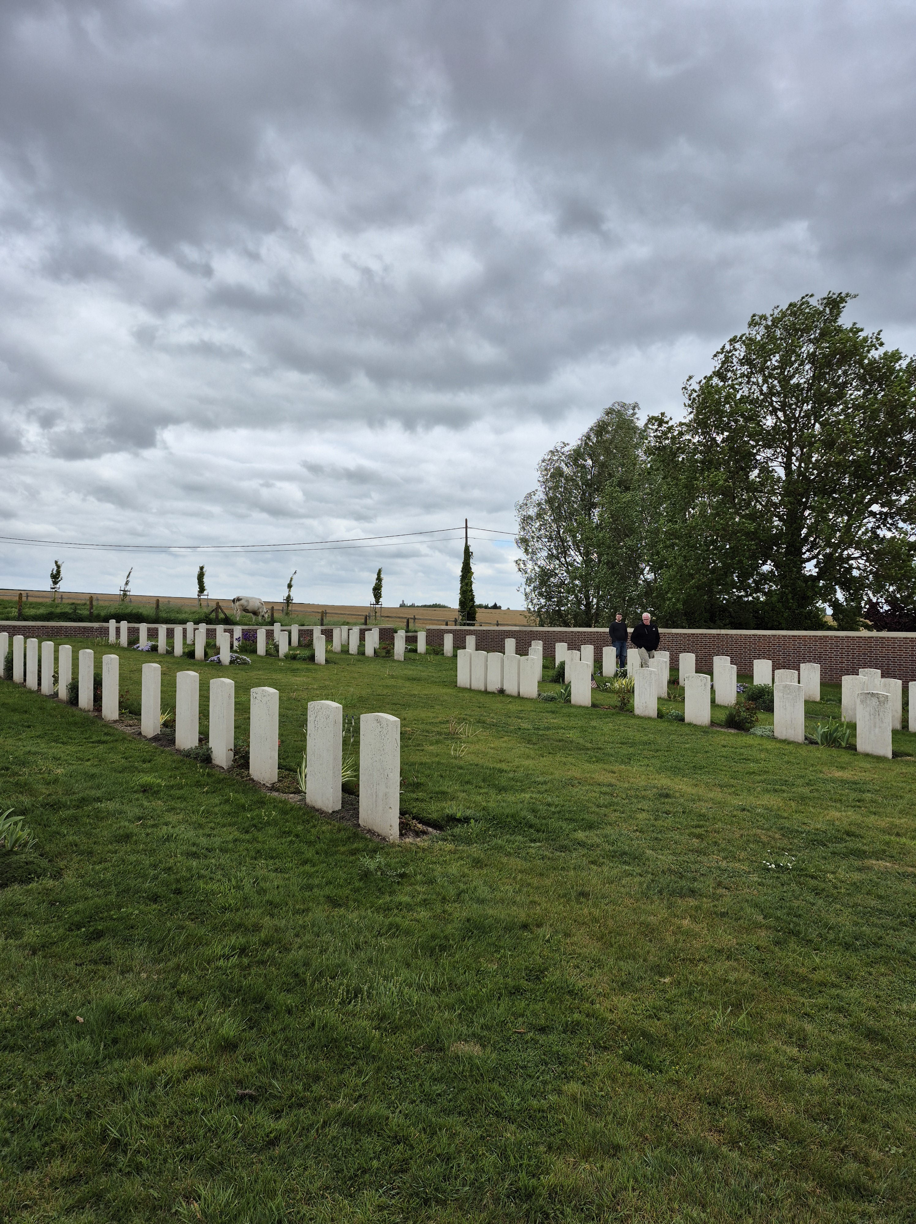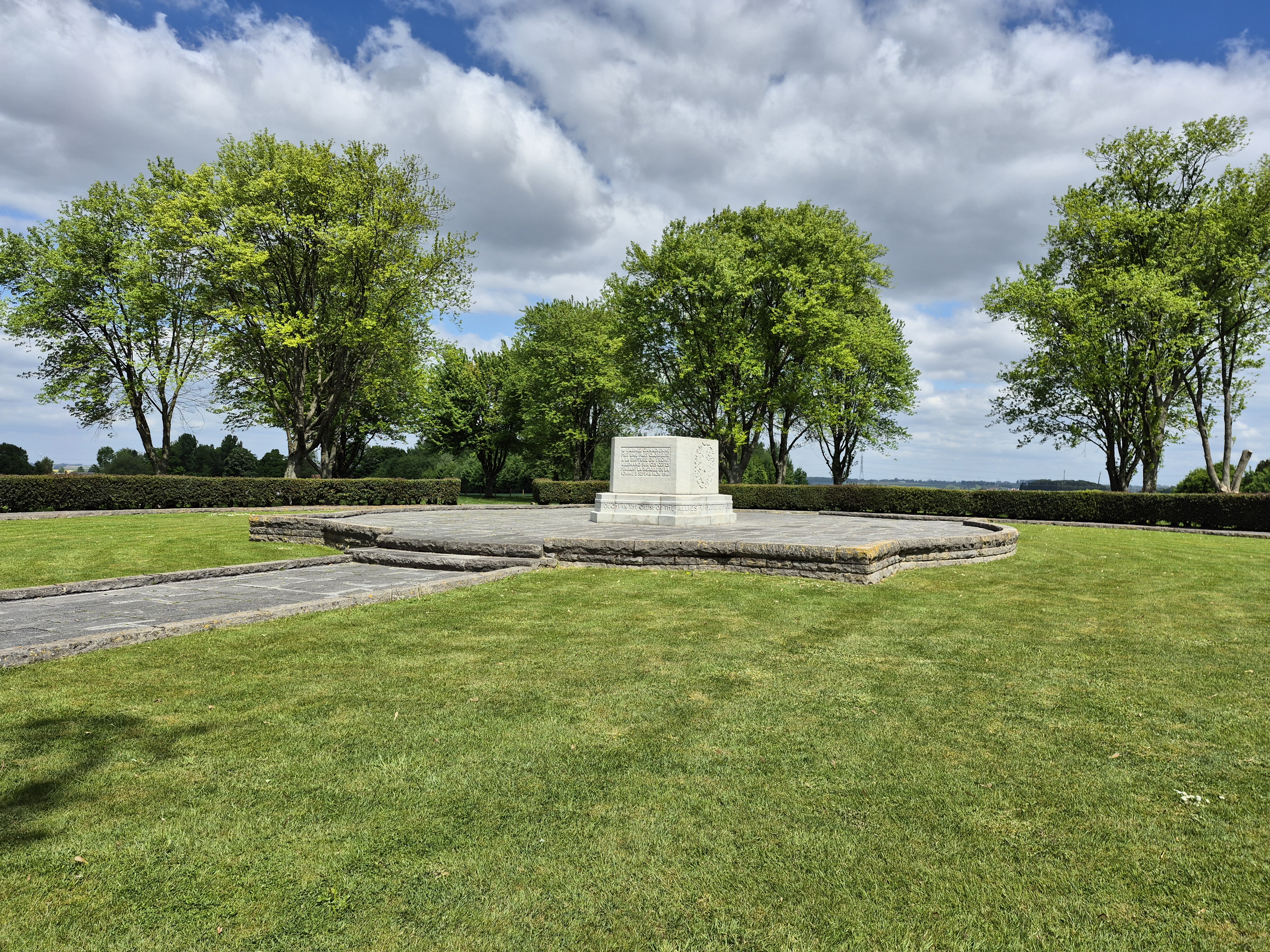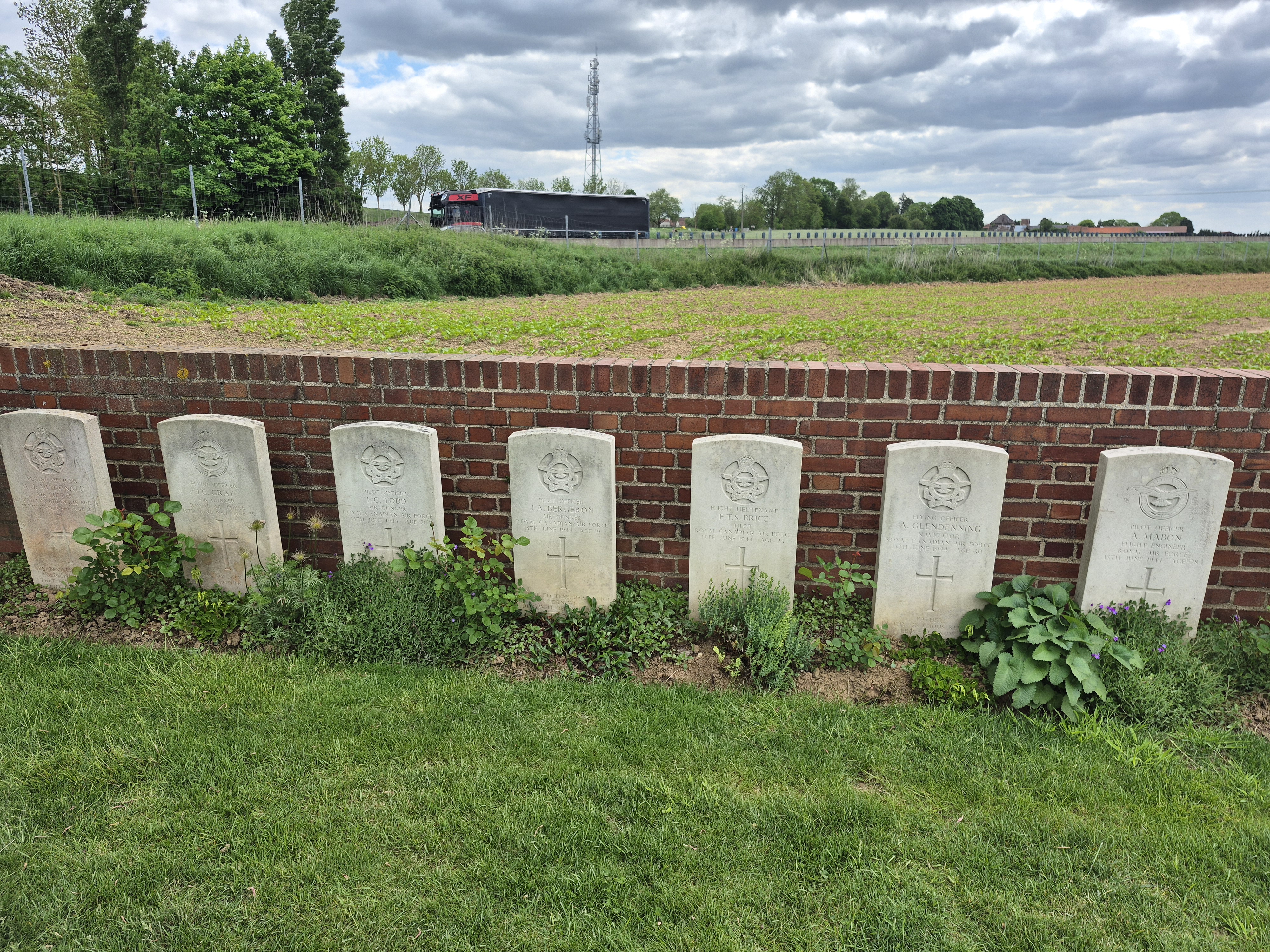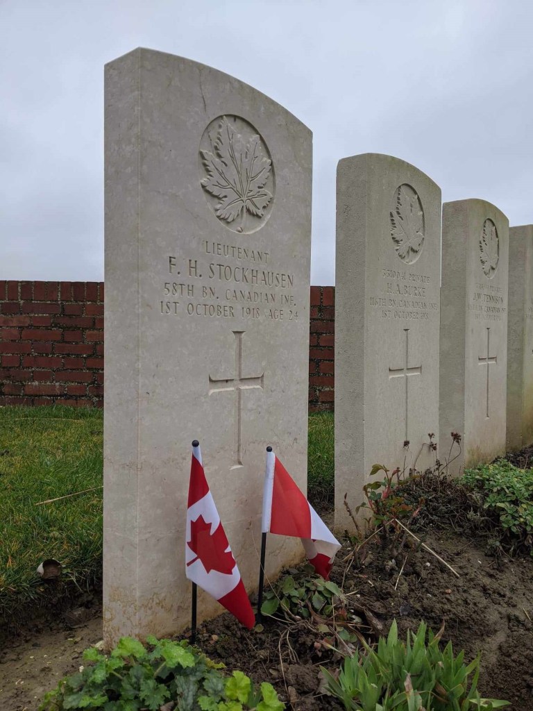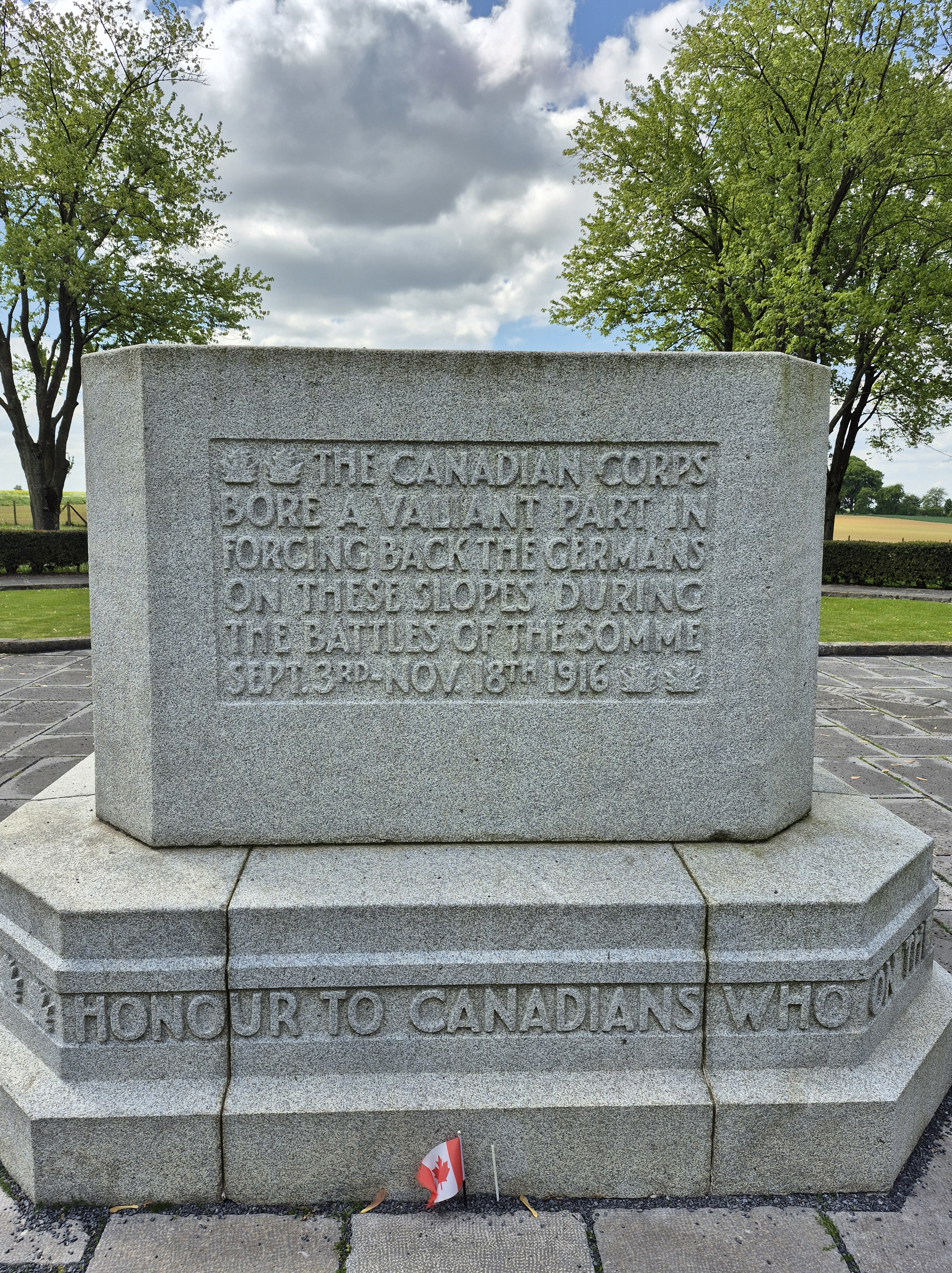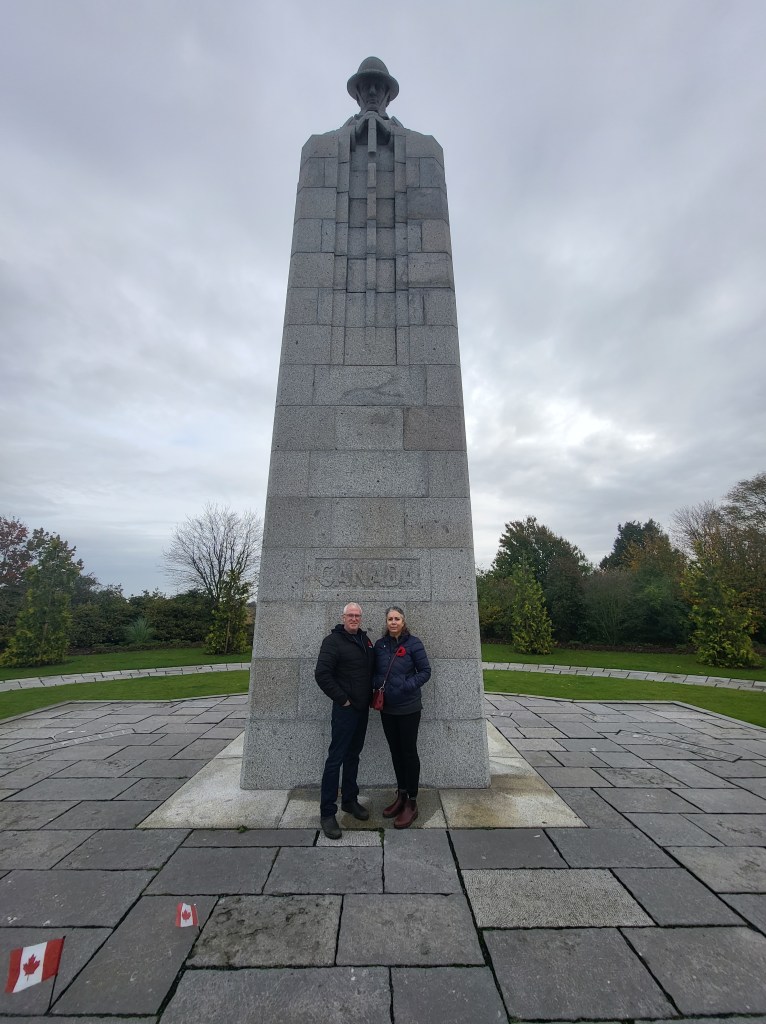 It was such a short trip and we packed a great deal into those six days. I completely forgot to write about the sites we visited in France on the Monday, day three. Leaving Ypres early, we headed south to the Somme. There we visited Beaumont-Hamel, Lochnagar Crater, the Canadian Monument in Courcelette, The British Tank Division Monument, the Windmill and finally drove to Cambrai to visit a friend’s great-uncle. In a tiny, out of the way cemetery, along with the Canadian casualties of the 100 Days/Canal du Nord fighting, there were the graves of a RCAF Lancaster bomber crew, lost in a bombing raid over Cambrai in 1944.