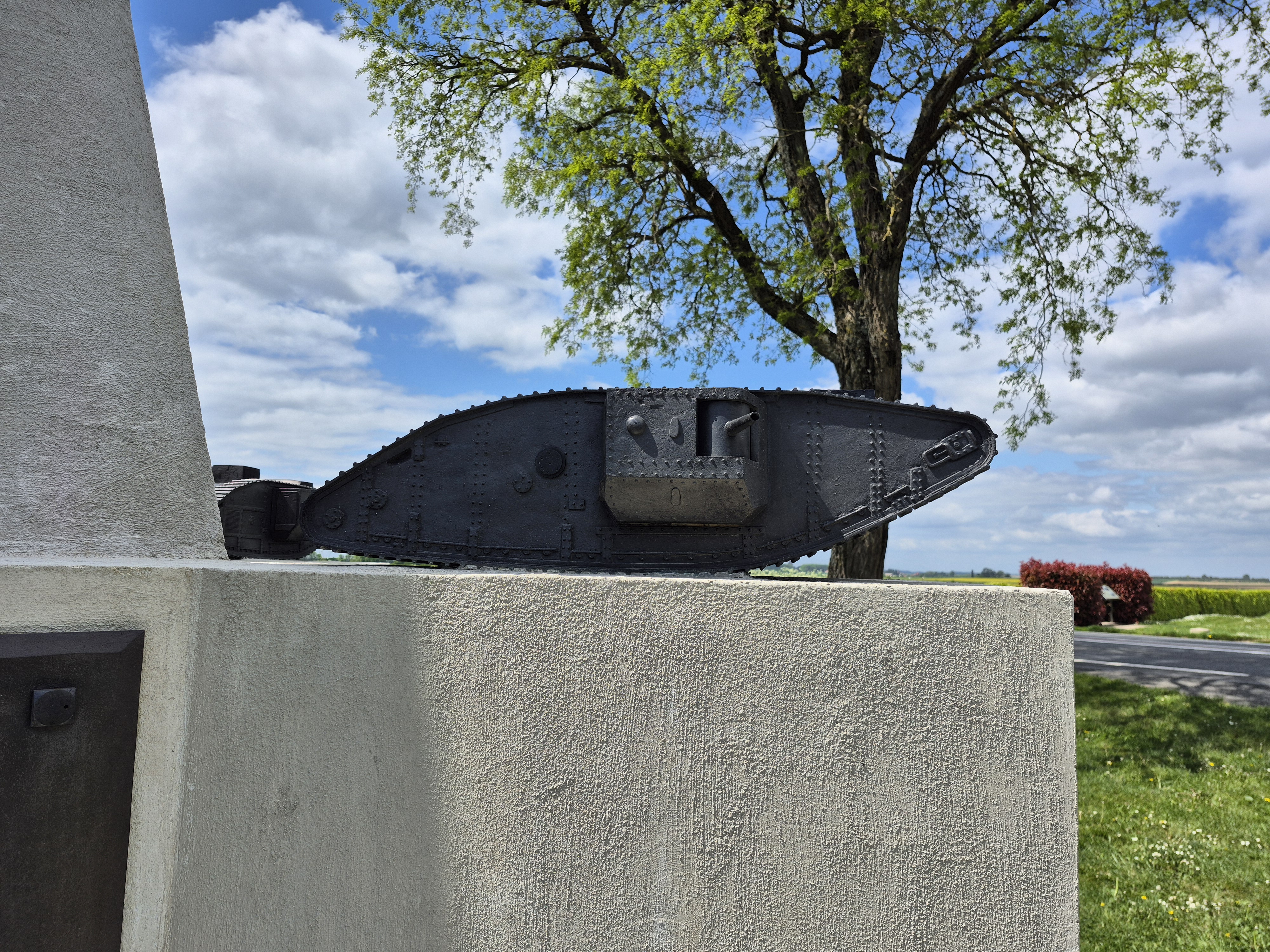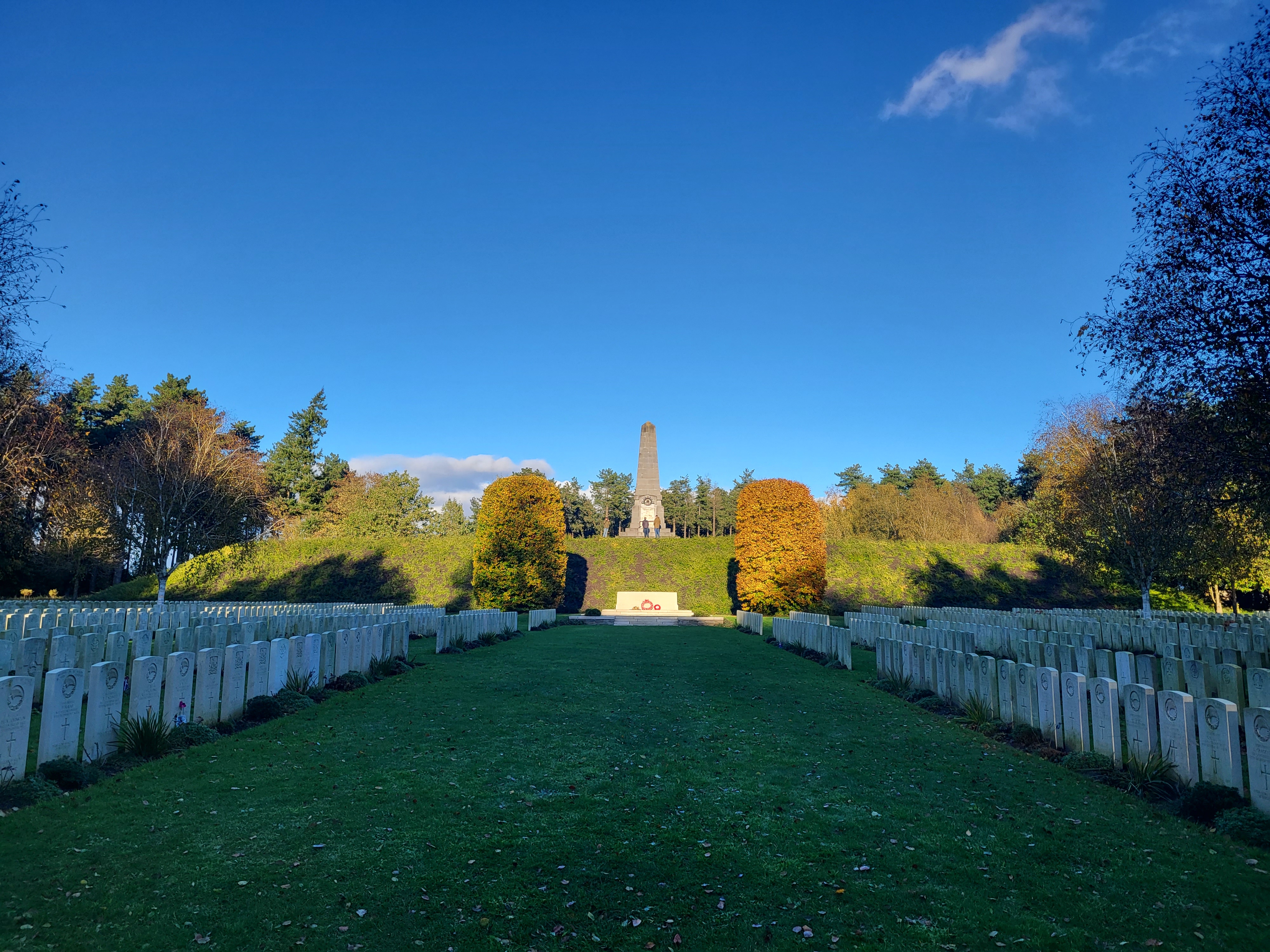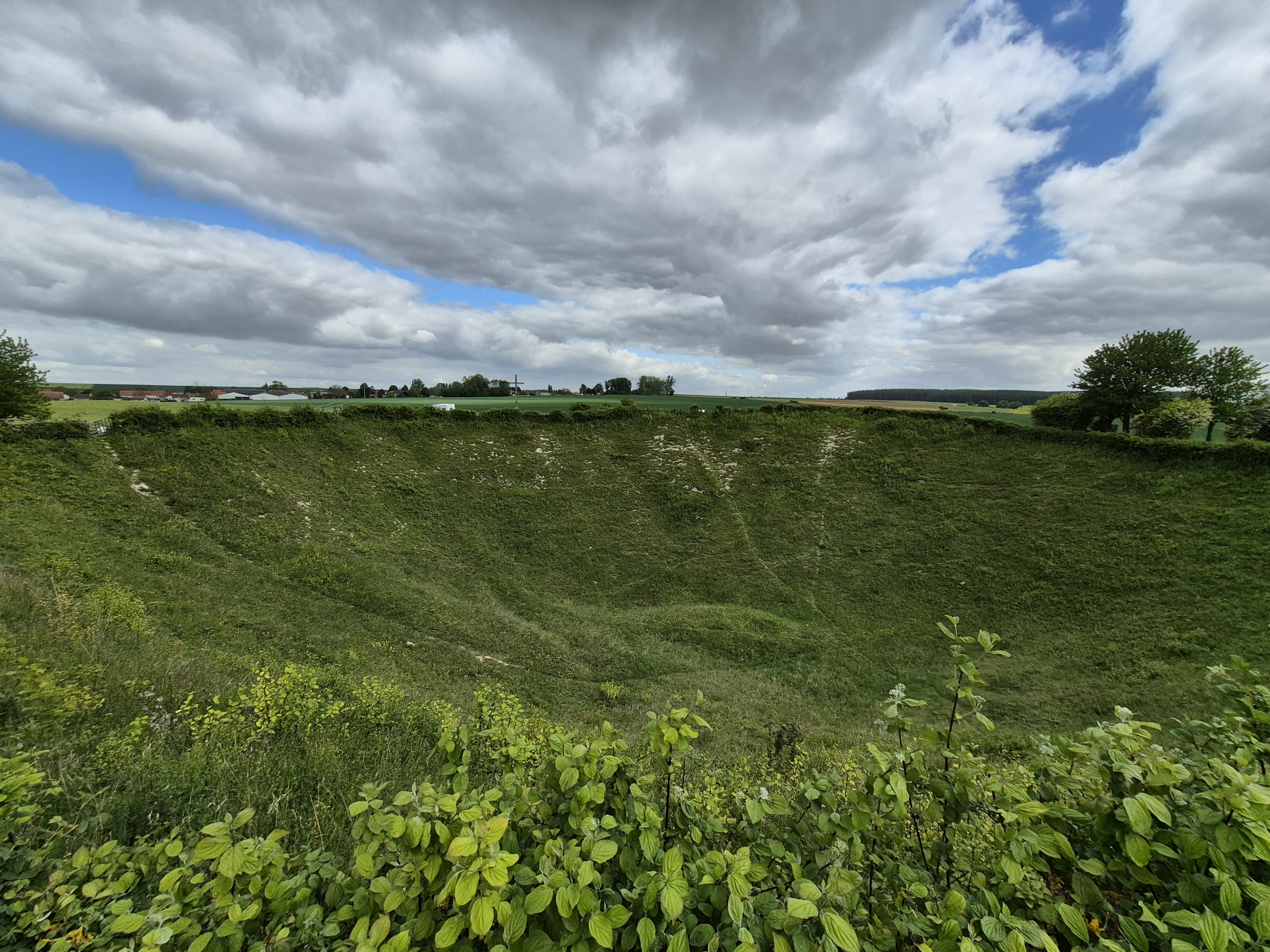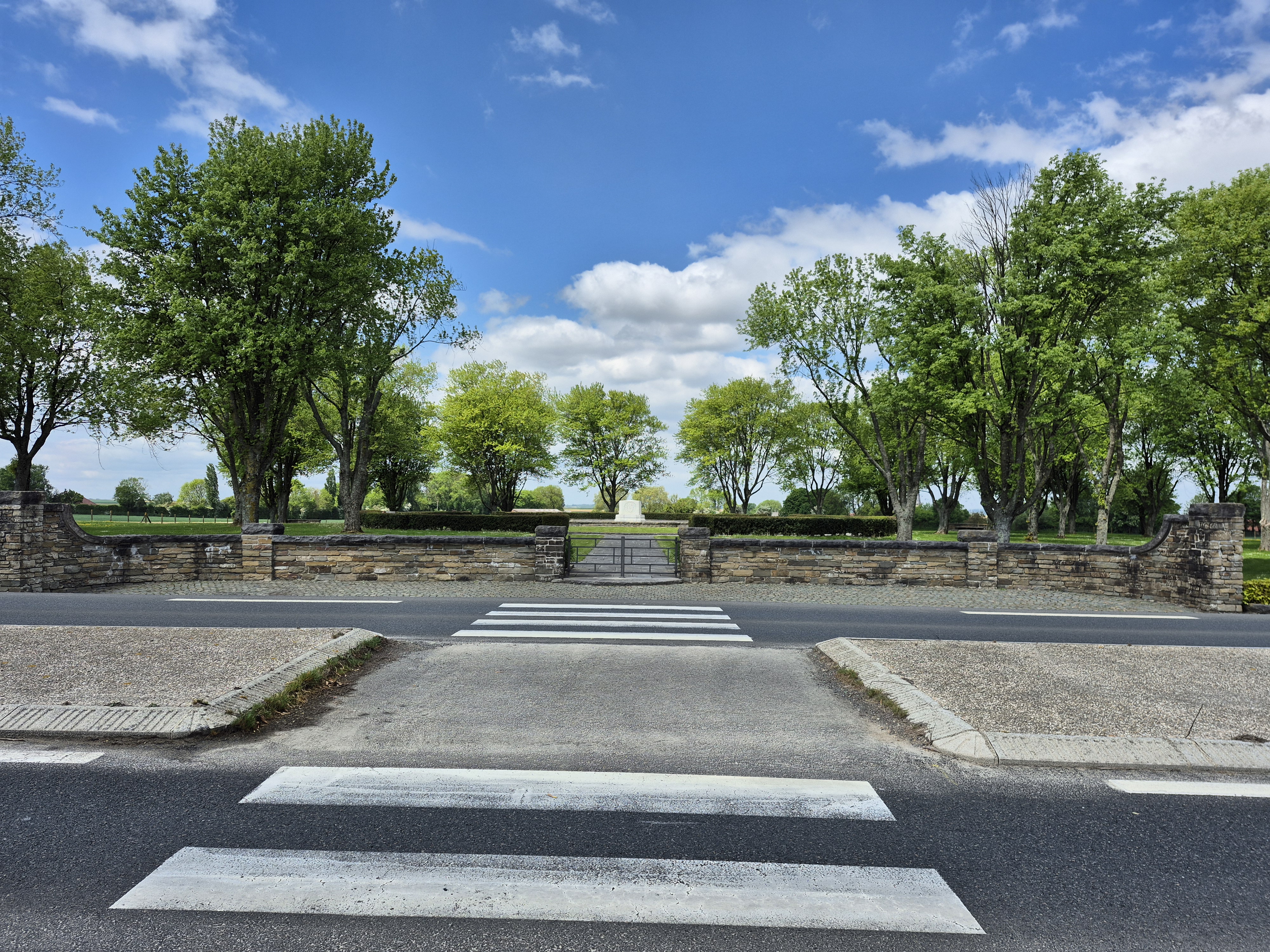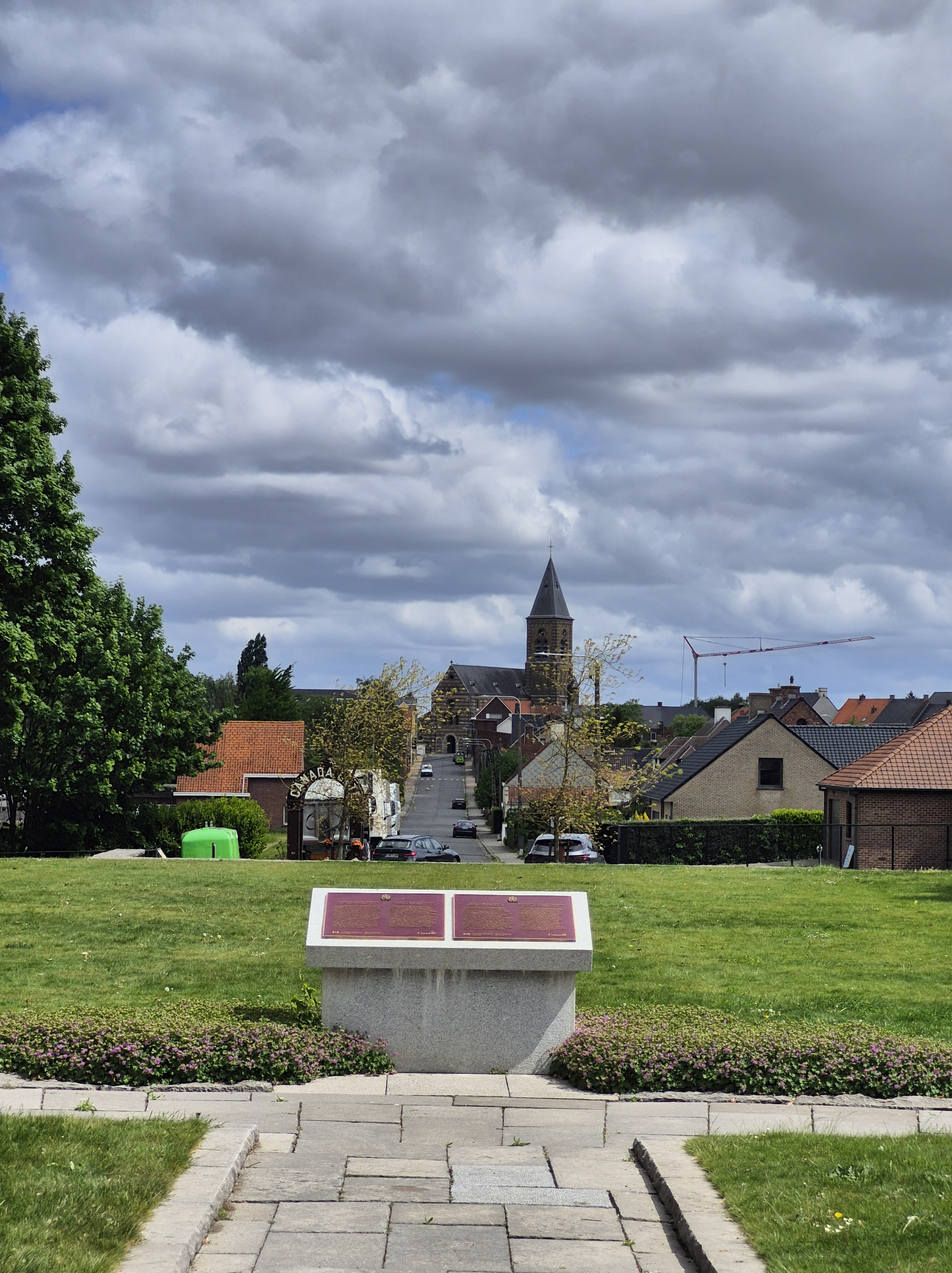 It was such a short trip and we packed a great deal into those six days. I completely forgot to write about the sites we visited in France on the Monday, day three. Leaving Ypres early, we headed south to the Somme. There we visited Beaumont-Hamel, Lochnagar Crater, the Canadian Monument in Courcelette, The British Tank Division Monument, the Windmill and finally drove to Cambrai to visit a friend’s great-uncle. In a tiny, out of the way cemetery, along with the Canadian casualties of the 100 Days/Canal du Nord fighting, there were the graves of a RCAF Lancaster bomber crew, lost in a bombing raid over Cambrai in 1944.