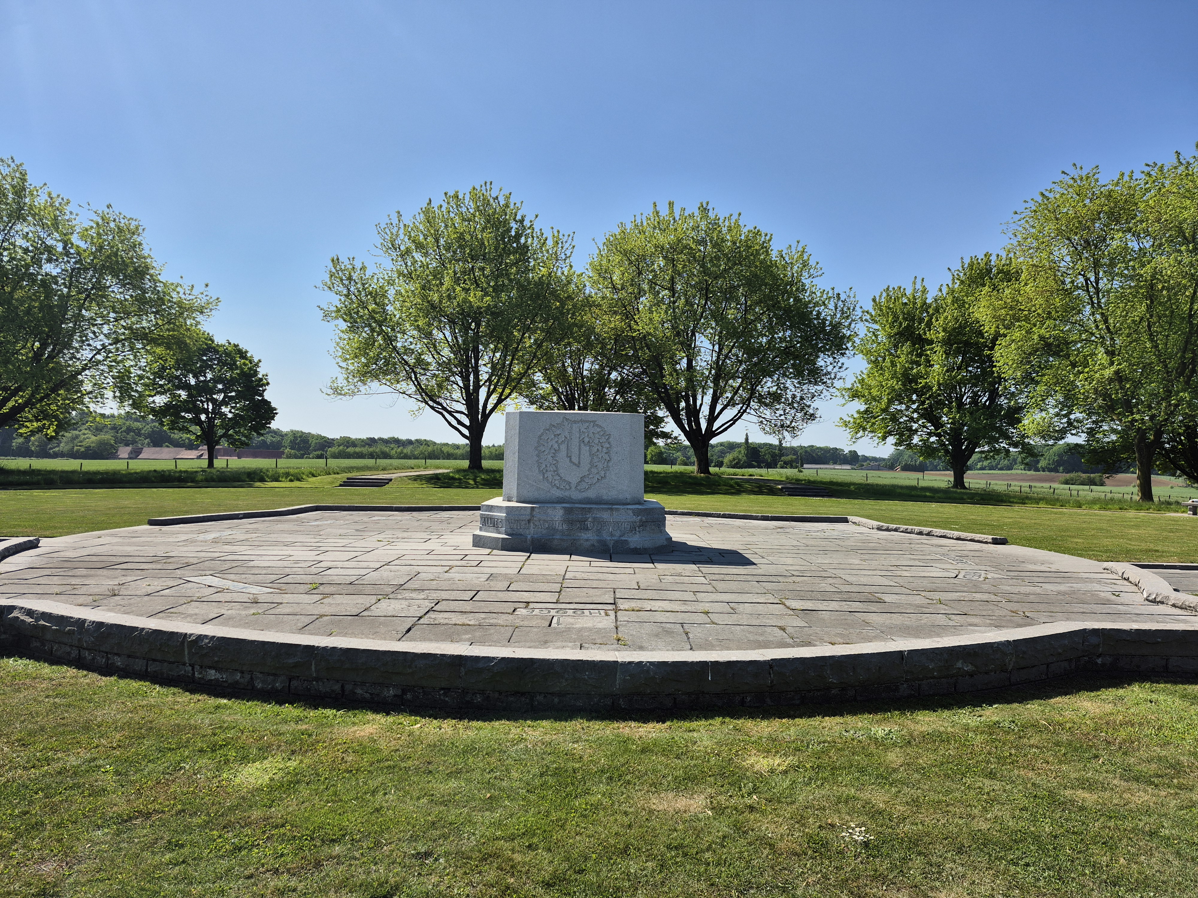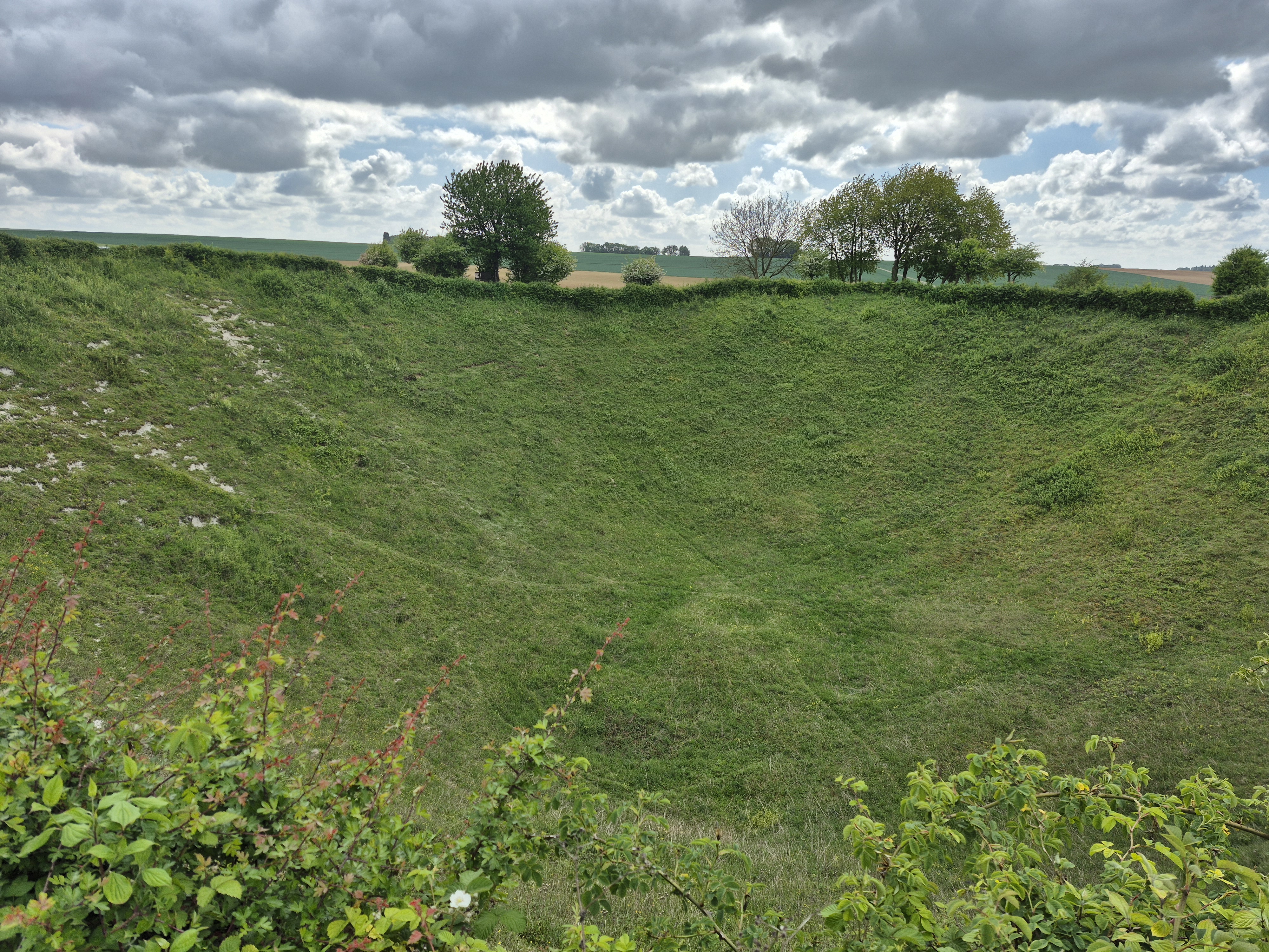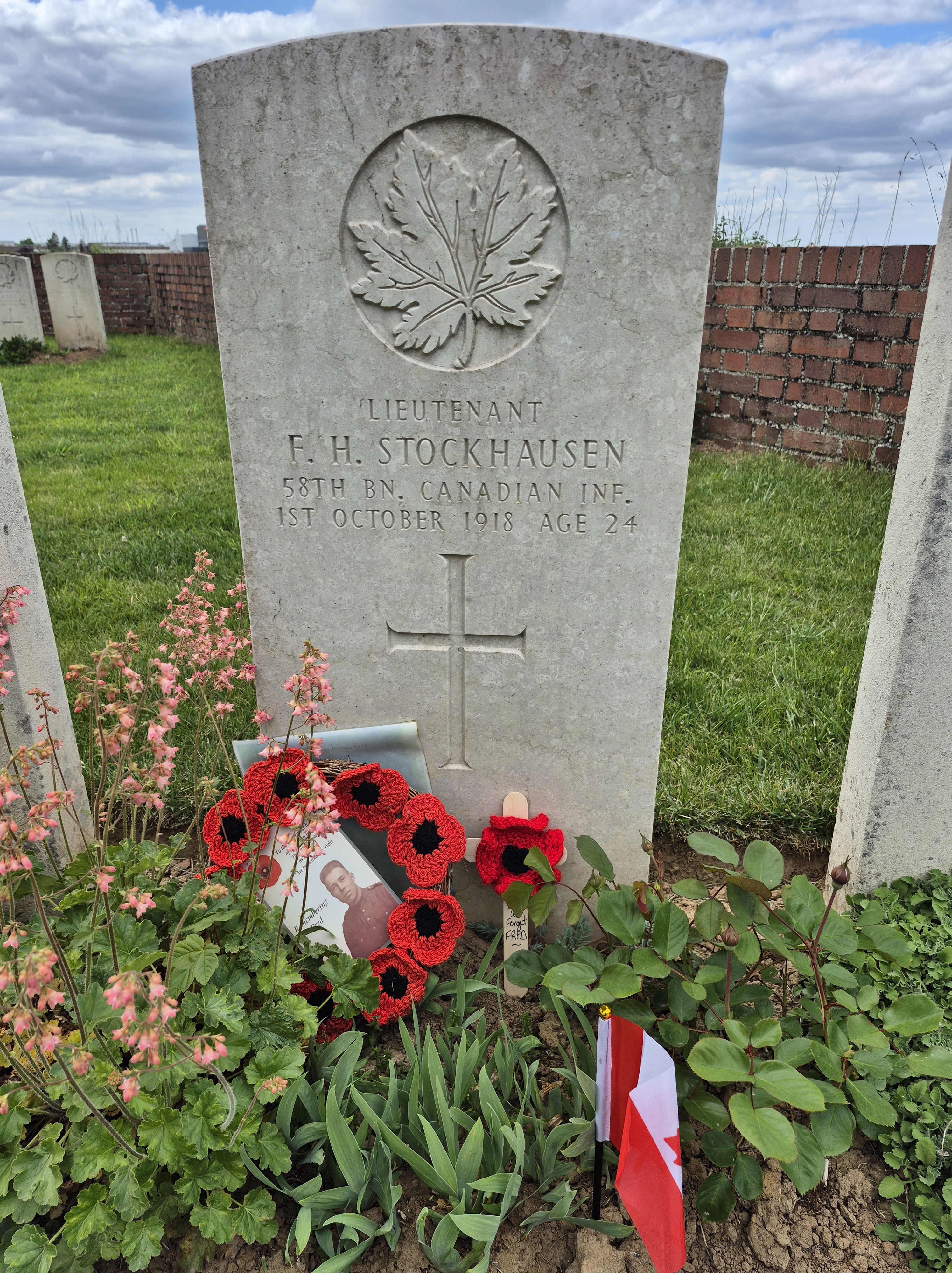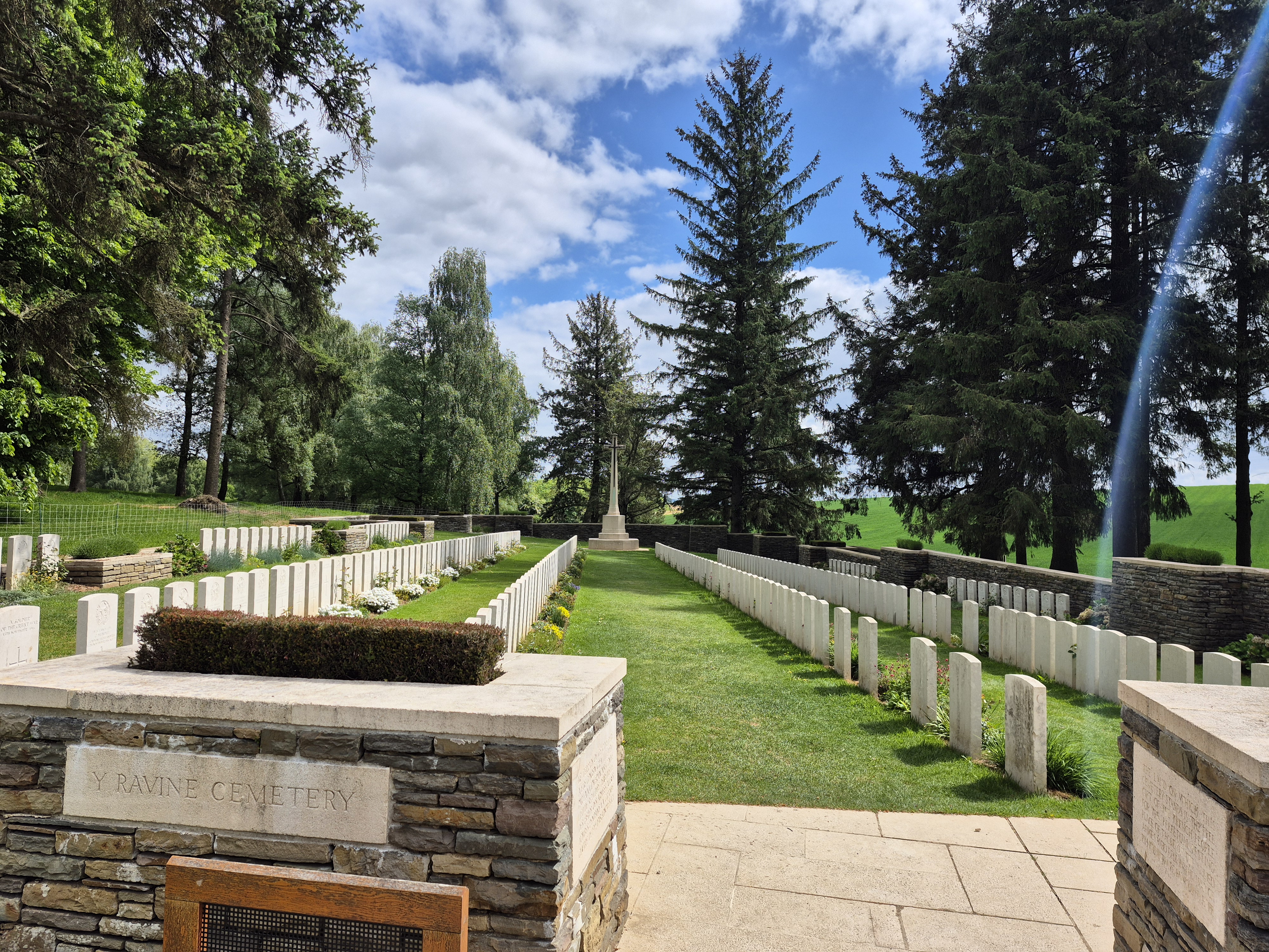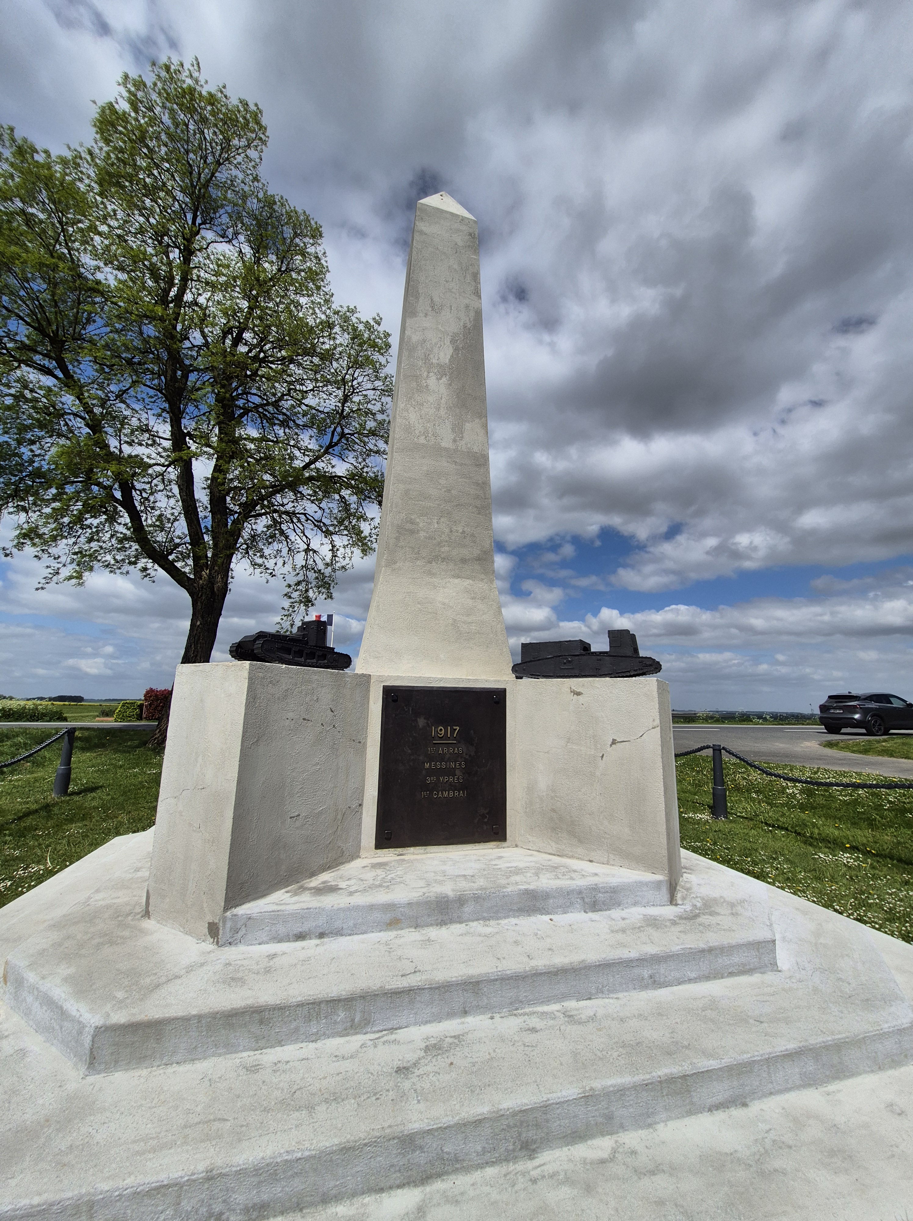 It was such a short trip and we packed a great deal into those six days. I completely forgot to write about the sites we visited in France on the Monday, day three. Leaving Ypres early, we headed south to the Somme. There we visited Beaumont-Hamel, Lochnagar Crater, the Canadian Monument in Courcelette, The British Tank Division Monument, the Windmill and finally drove to Cambrai to visit a friend’s great-uncle. In a tiny, out of the way cemetery, along with the Canadian casualties of the 100 Days/Canal du Nord fighting, there were the graves of a RCAF Lancaster bomber crew, lost in a bombing raid over Cambrai in 1944.