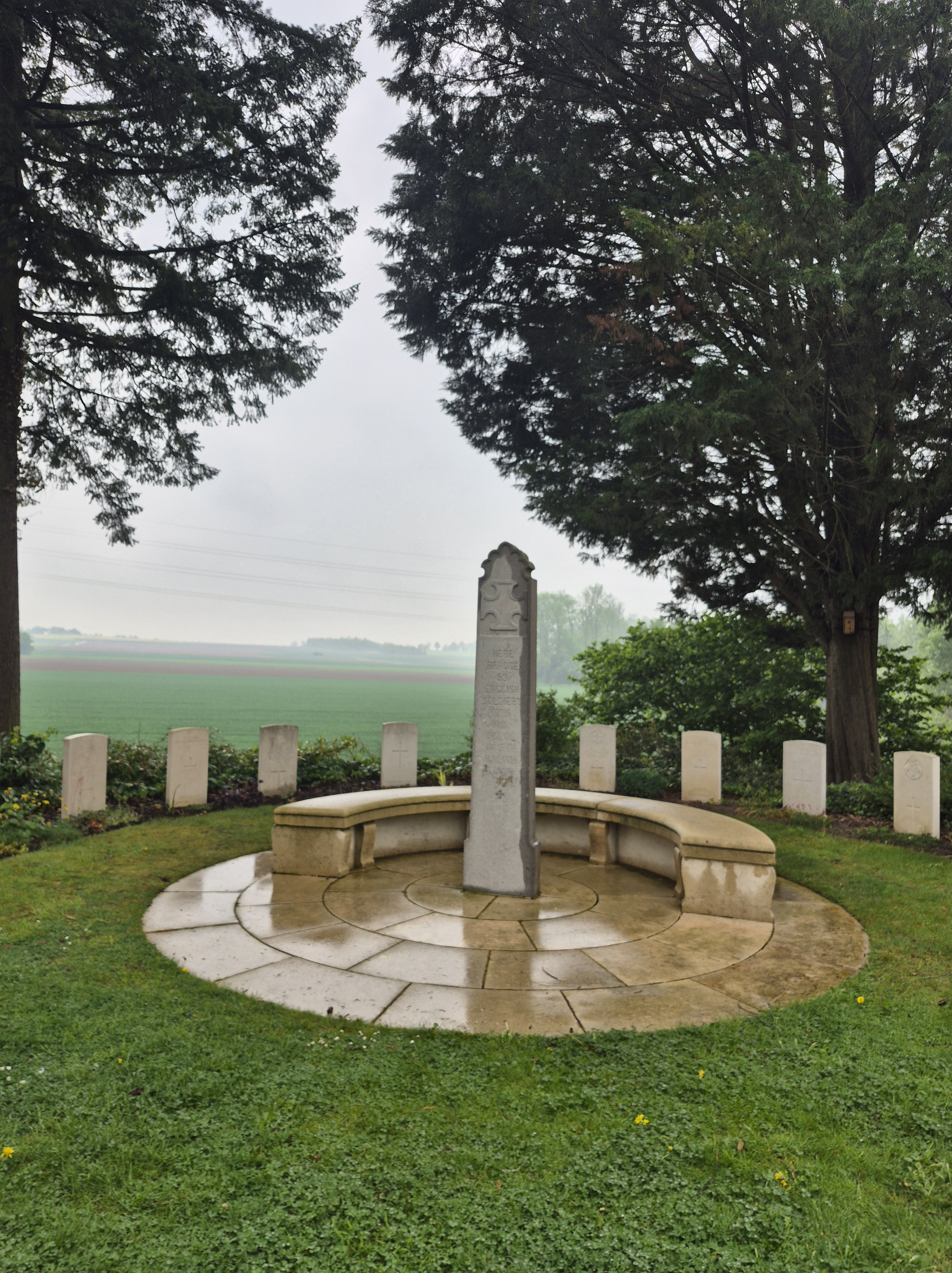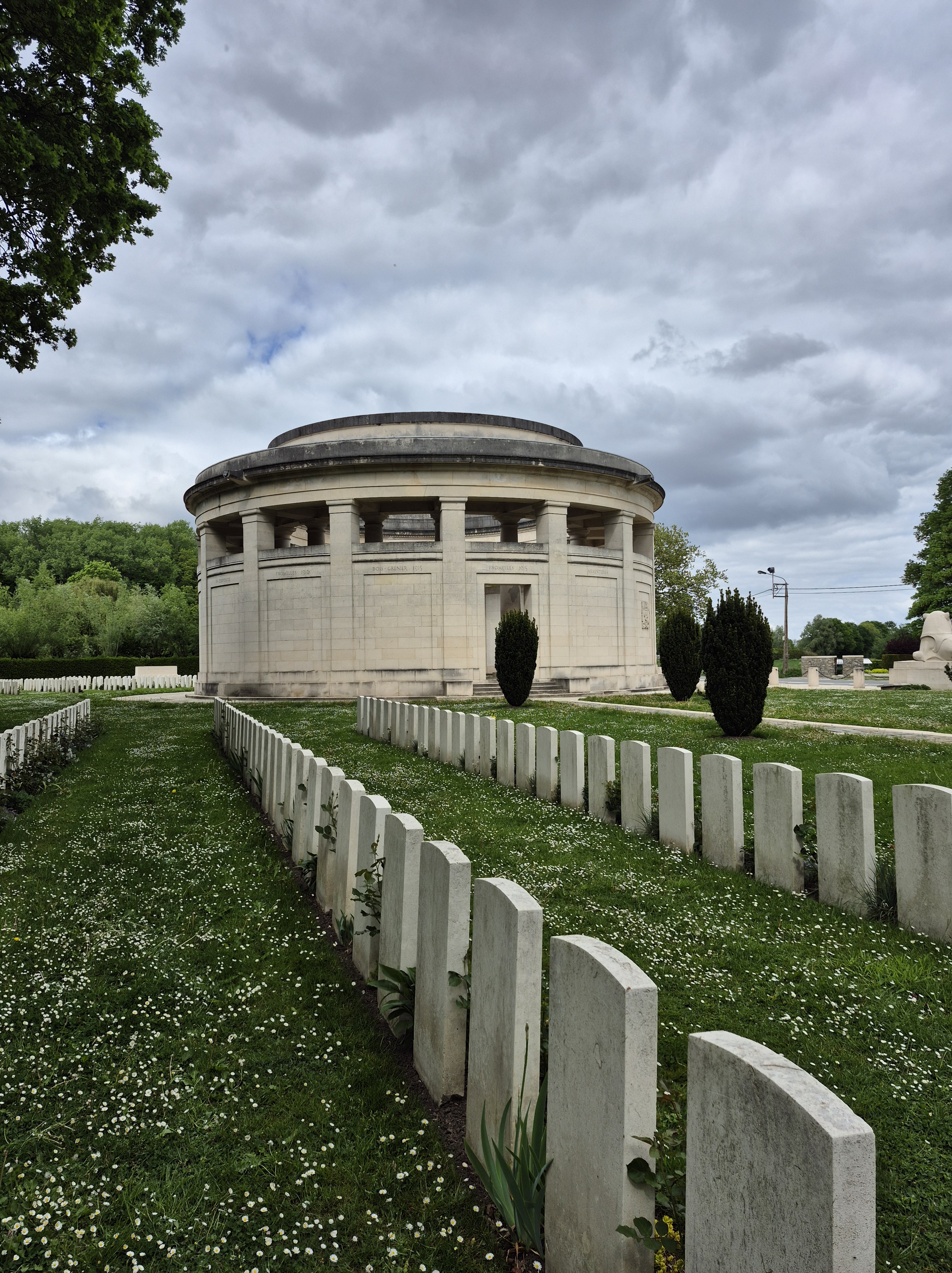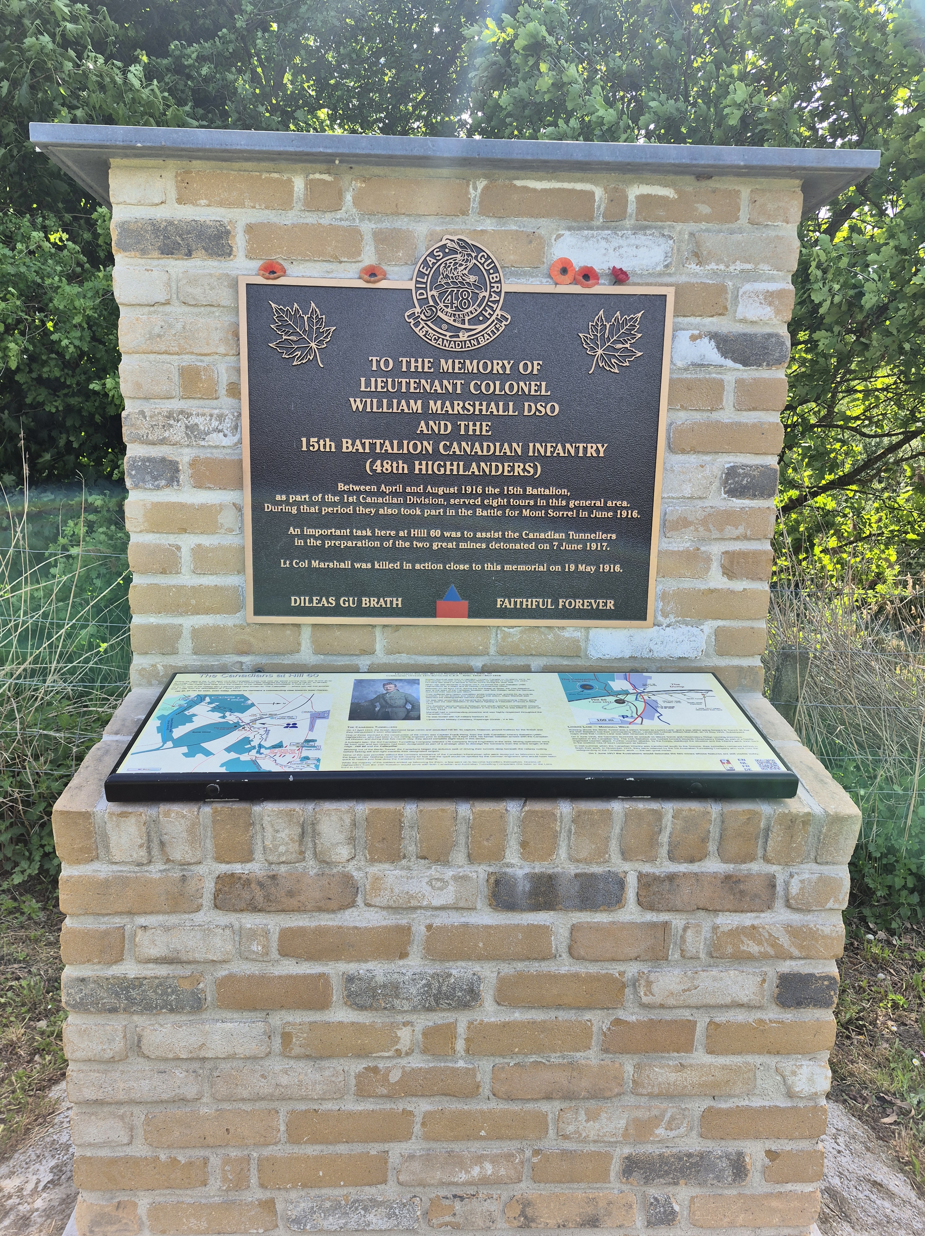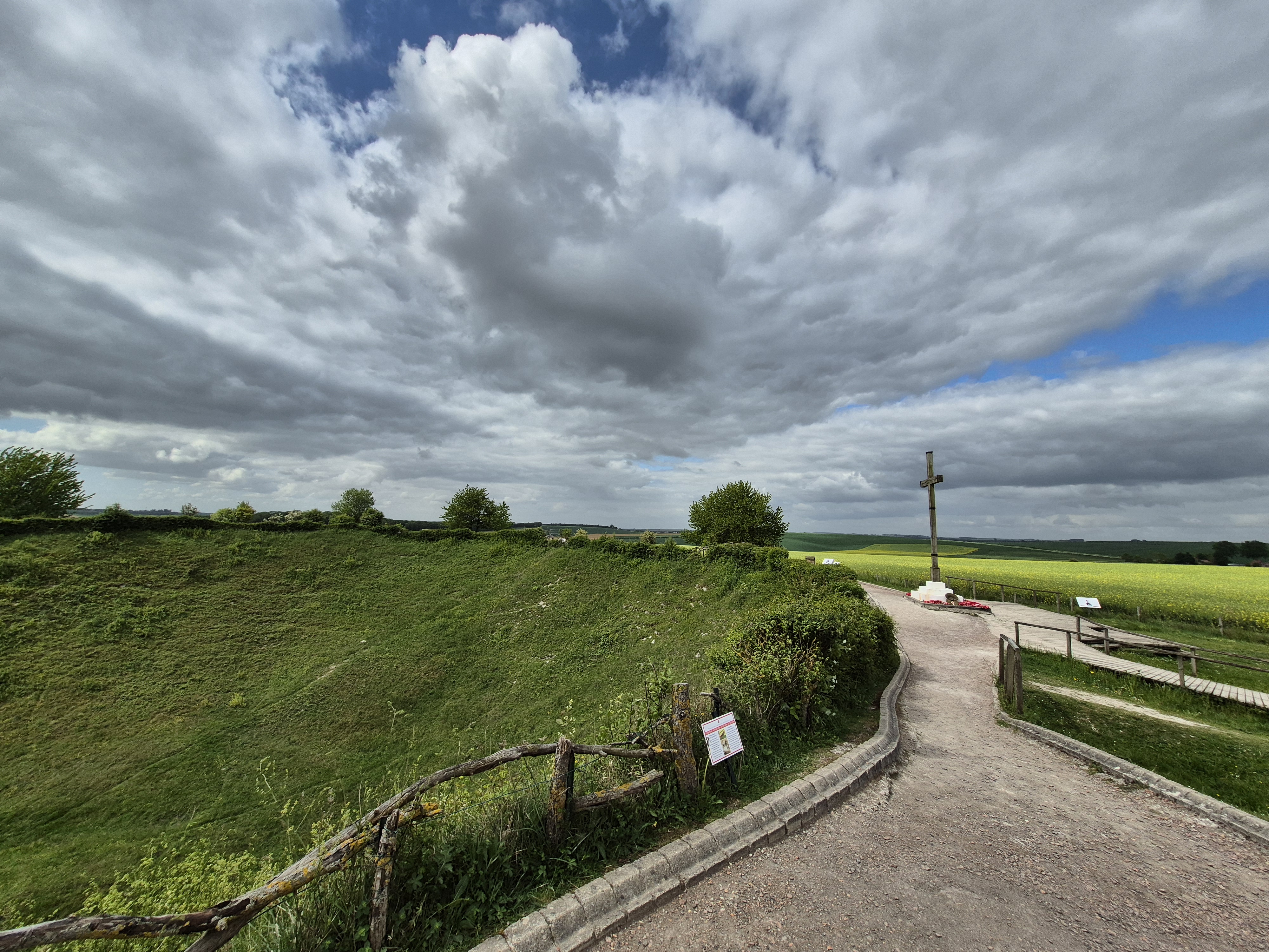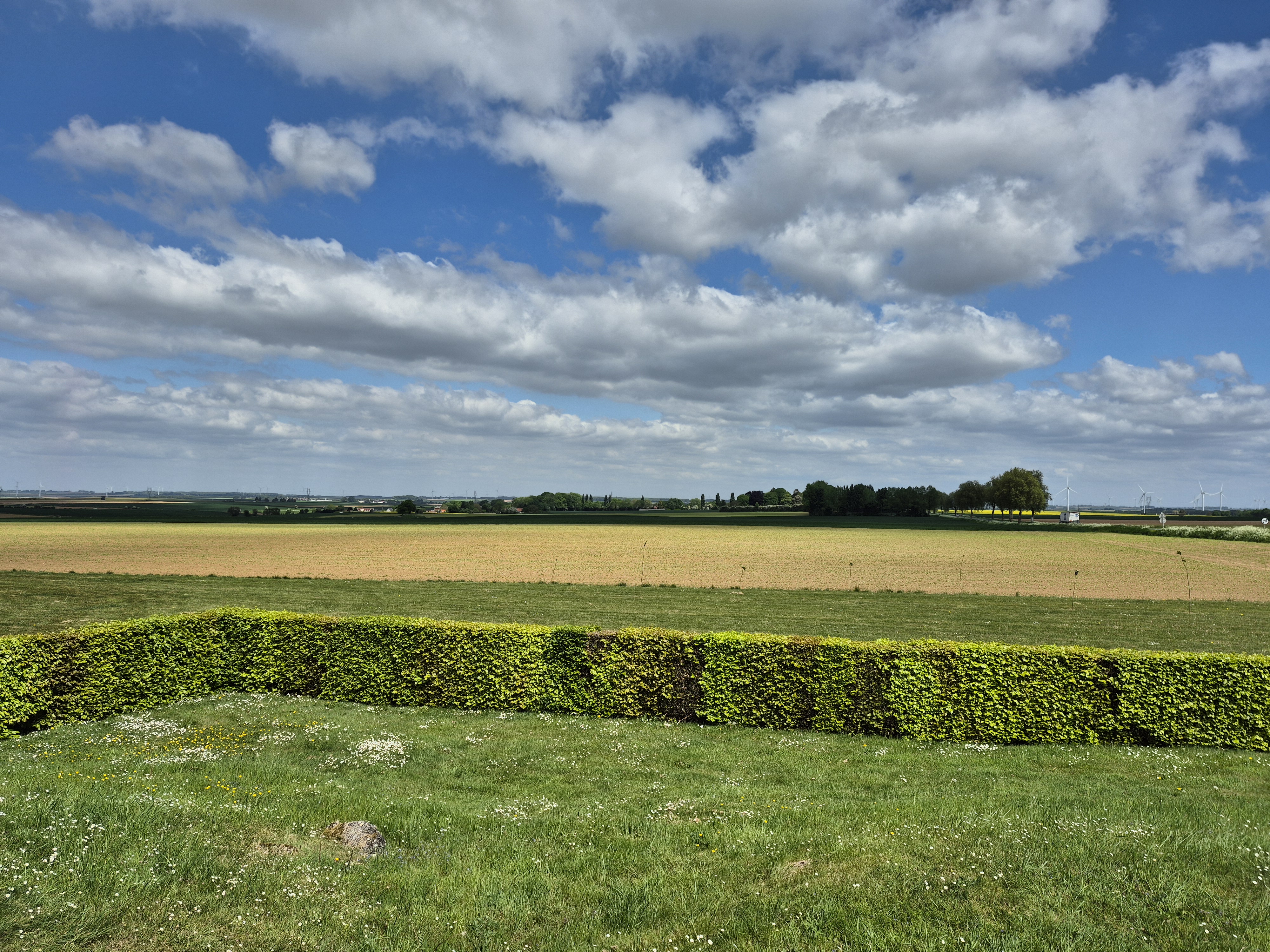 It was such a short trip and we packed a great deal into those six days. I completely forgot to write about the sites we visited in France on the Monday, day three. Leaving Ypres early, we headed south to the Somme. There we visited Beaumont-Hamel, Lochnagar Crater, the Canadian Monument in Courcelette, The British Tank Division Monument, the Windmill and finally drove to Cambrai to visit a friend’s great-uncle. In a tiny, out of the way cemetery, along with the Canadian casualties of the 100 Days/Canal du Nord fighting, there were the graves of a RCAF Lancaster bomber crew, lost in a bombing raid over Cambrai in 1944.