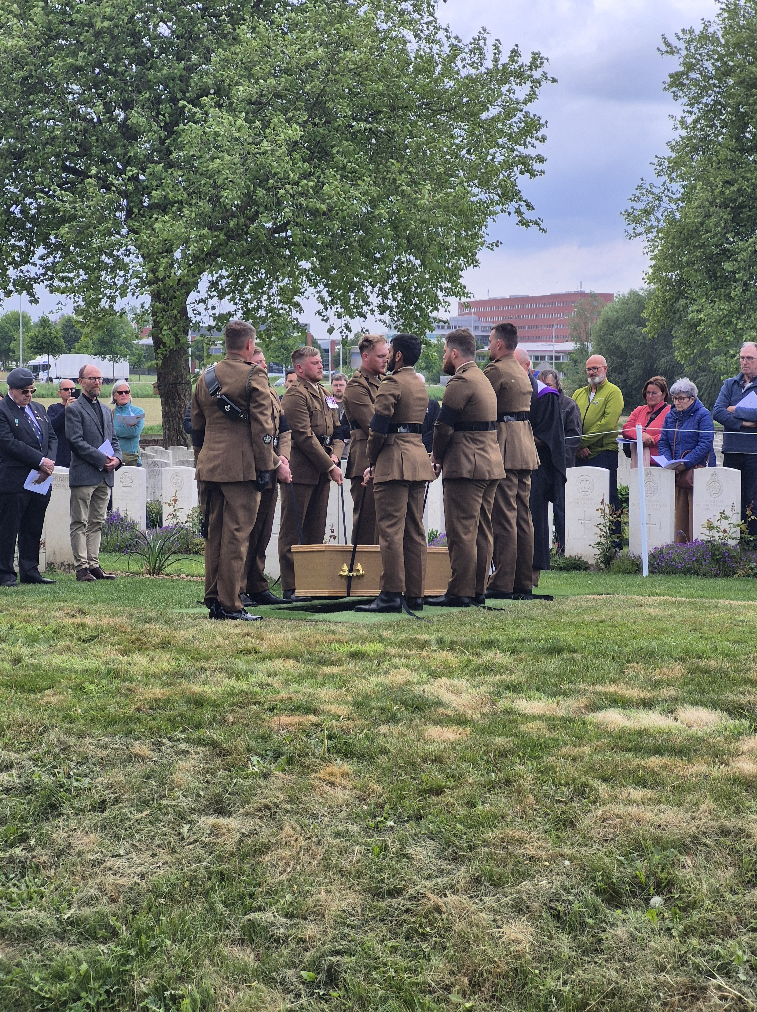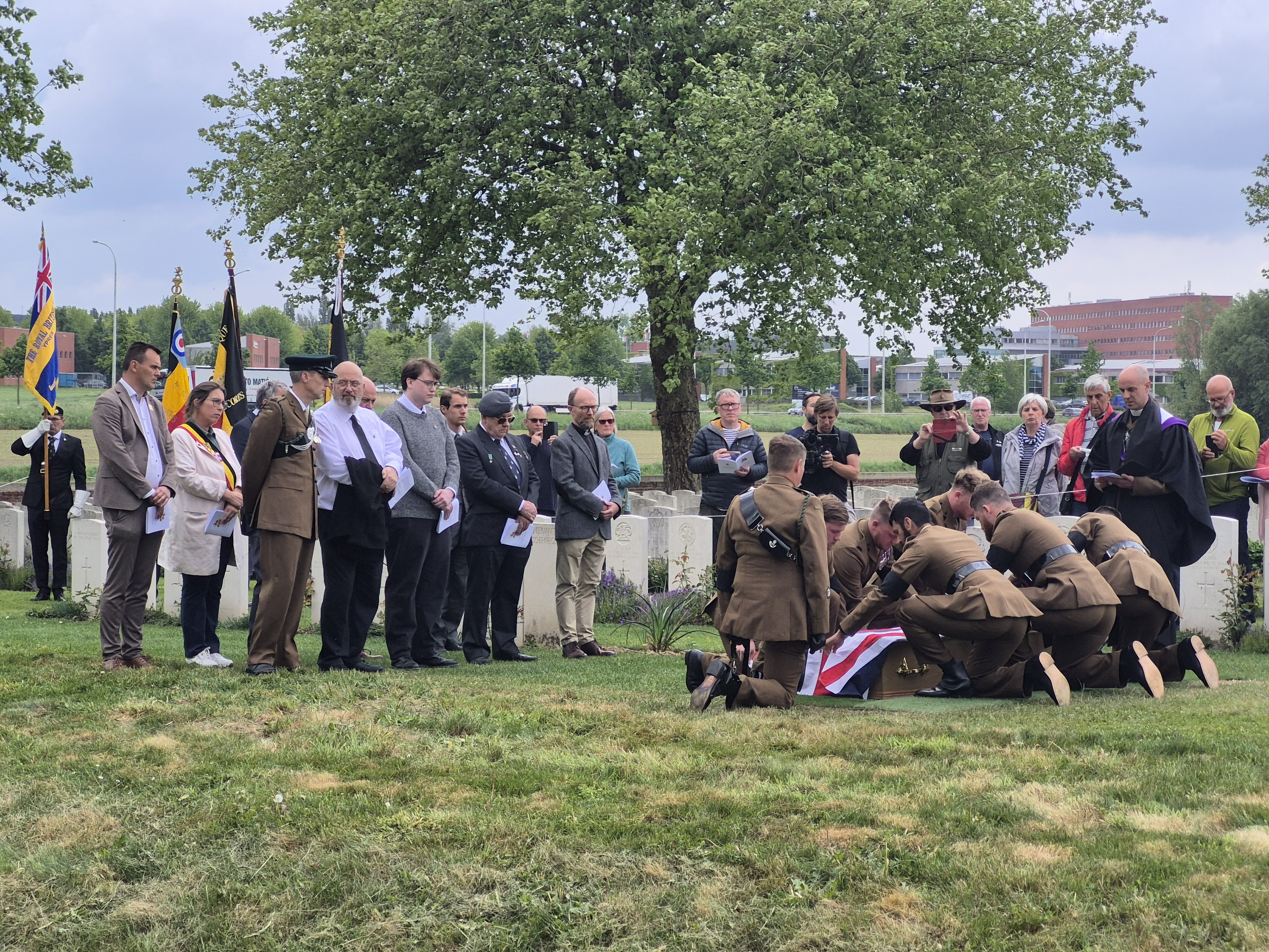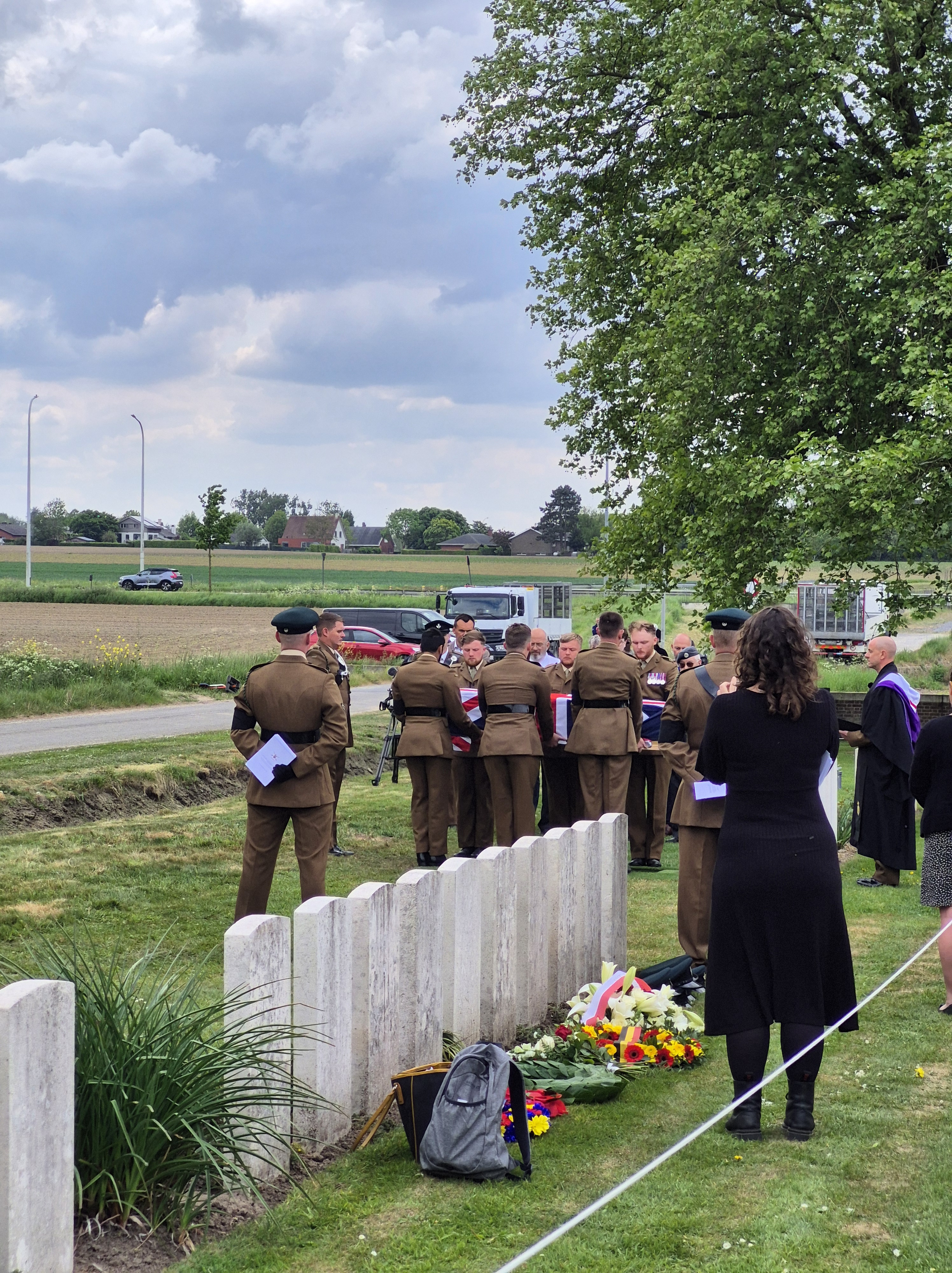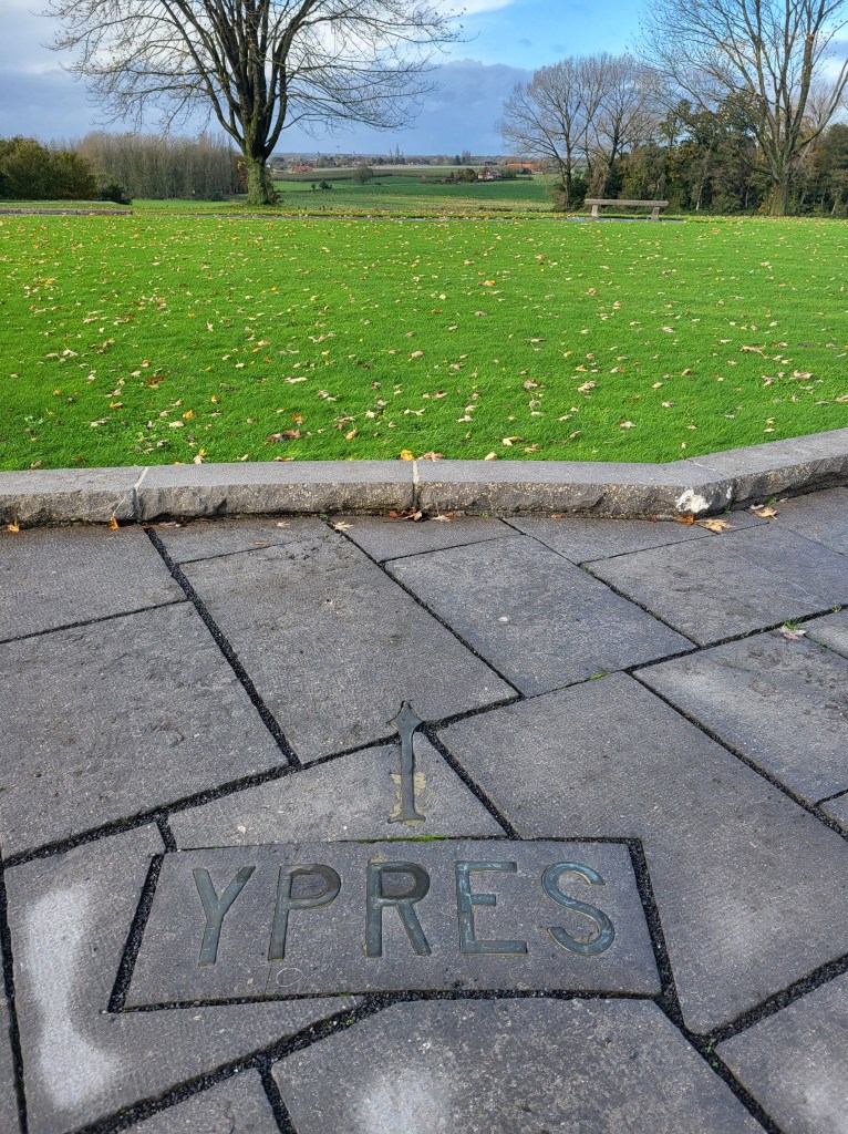 In the afternoon, we attended the reburial service for British soldier, Private John Tames. The third of three brothers to enlist, John was also the third brother to go missing in action, his older brothers in 1915, himself in 1917. What a terrible blow to his family! In 2018, during road building in Zonnebeke, John’s remains were unearthed and through DNA testing, were identified. He was laid to rest by members of his own regiment, watched over by his great-nephew, in the Irish New Cemetery near Ypres.
