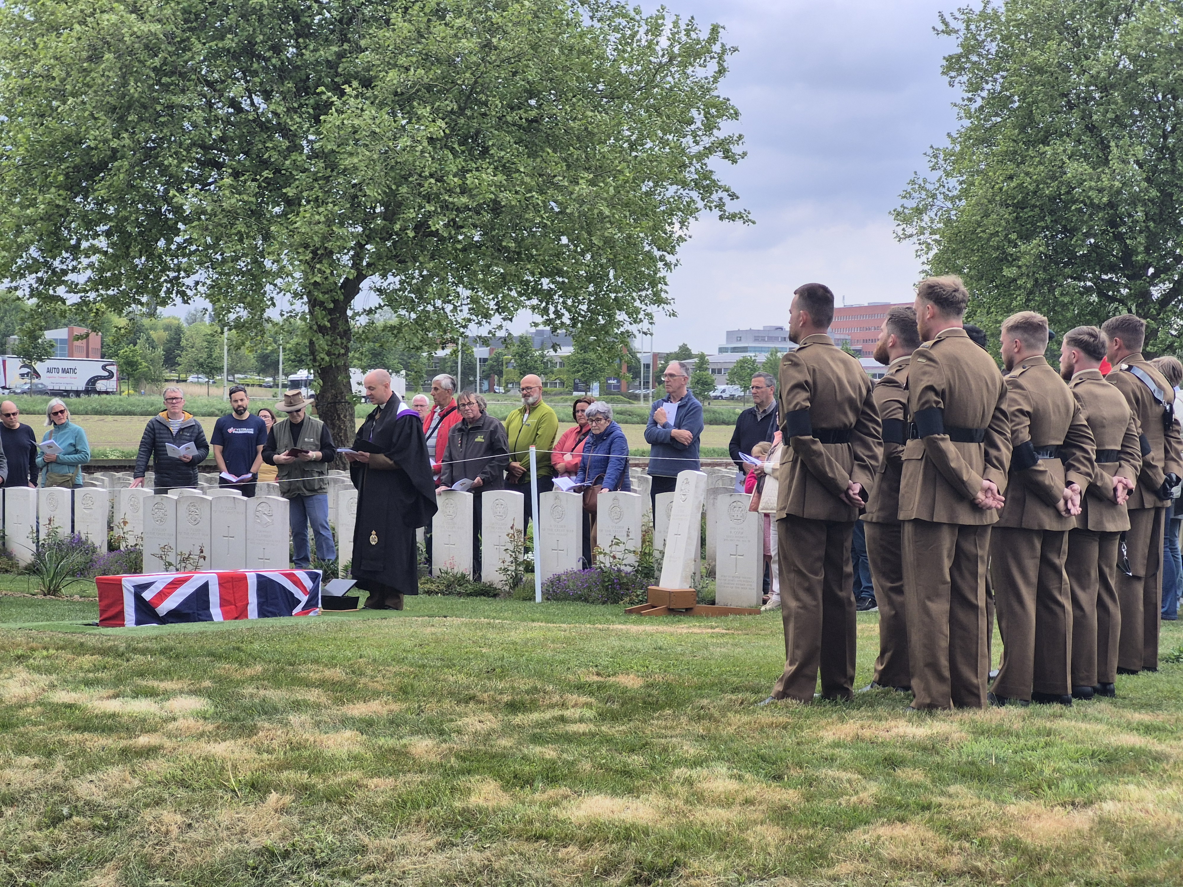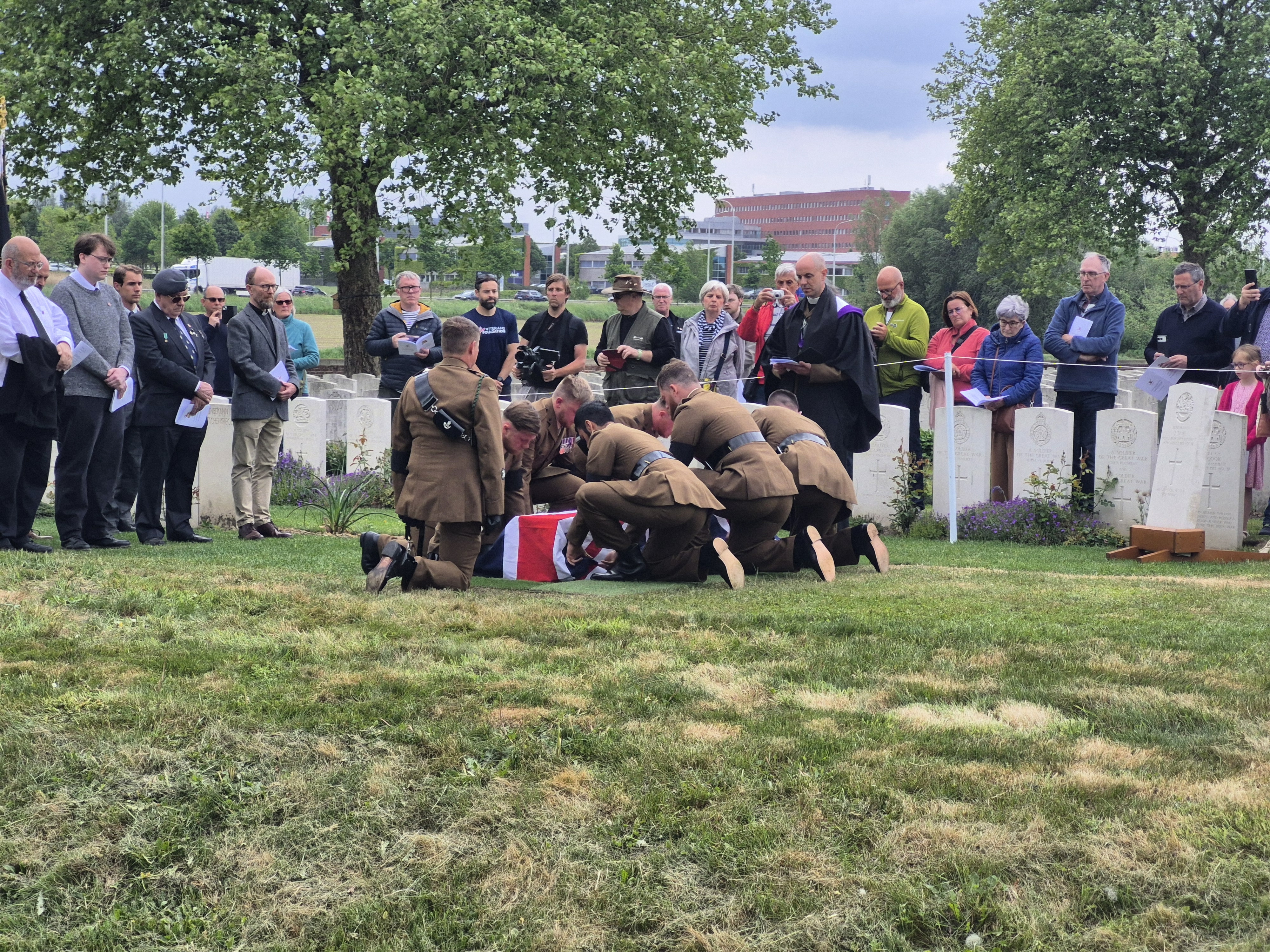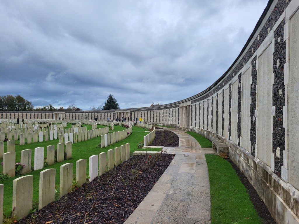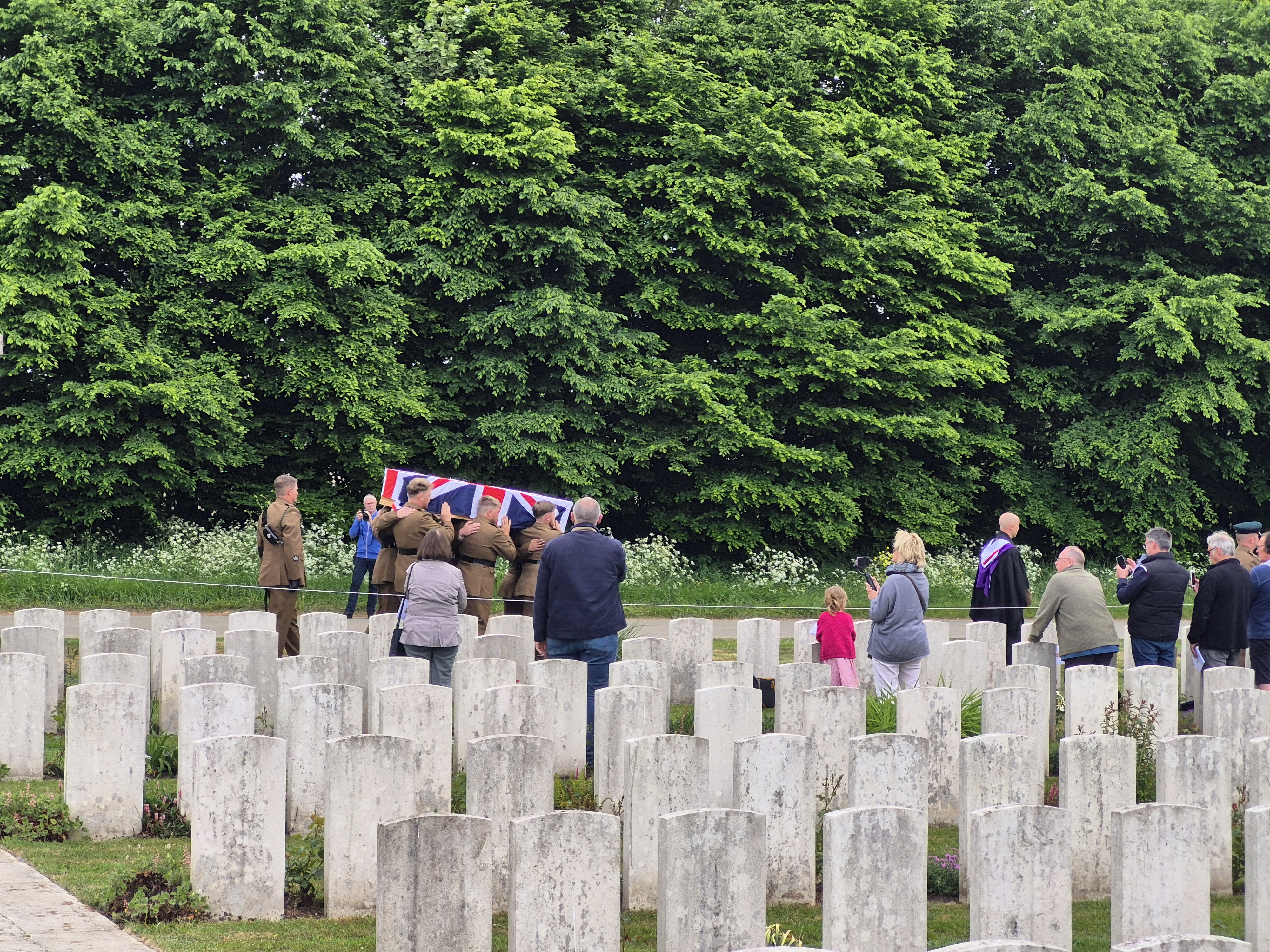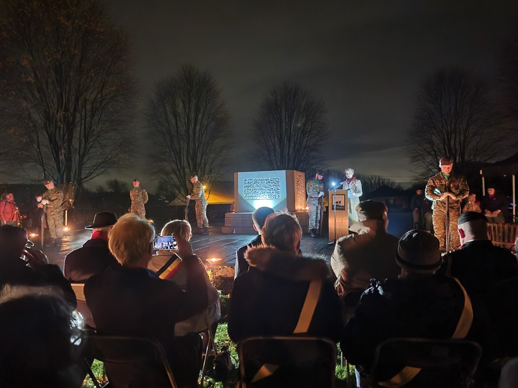 In the afternoon, we attended the reburial service for British soldier, Private John Tames. The third of three brothers to enlist, John was also the third brother to go missing in action, his older brothers in 1915, himself in 1917. What a terrible blow to his family! In 2018, during road building in Zonnebeke, John’s remains were unearthed and through DNA testing, were identified. He was laid to rest by members of his own regiment, watched over by his great-nephew, in the Irish New Cemetery near Ypres.
