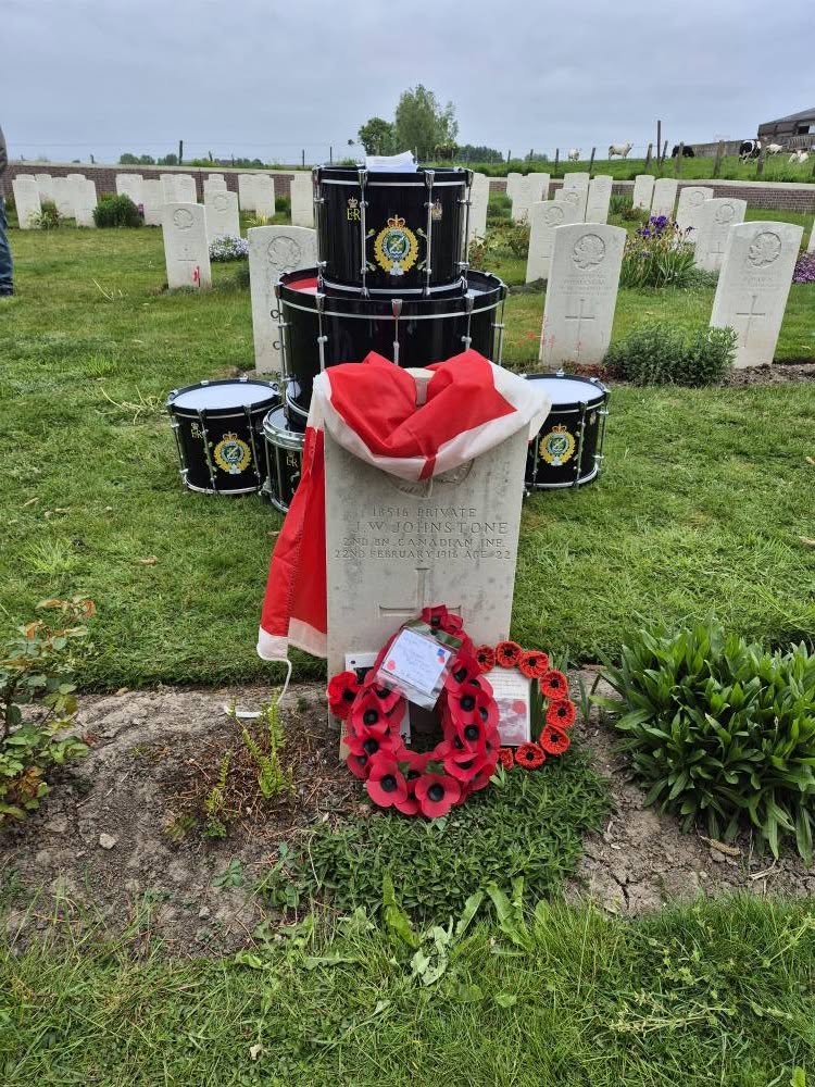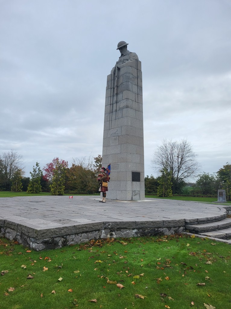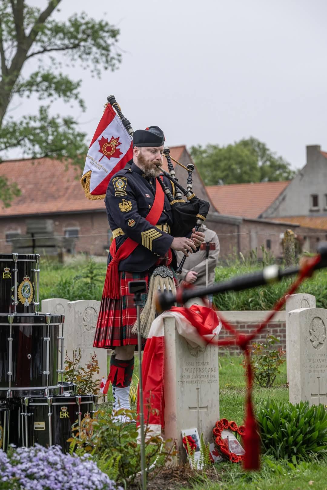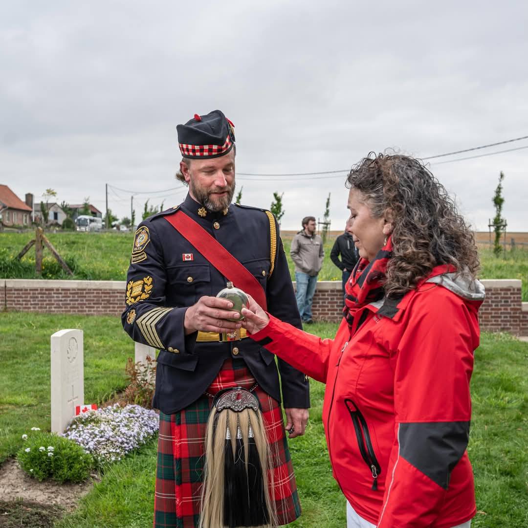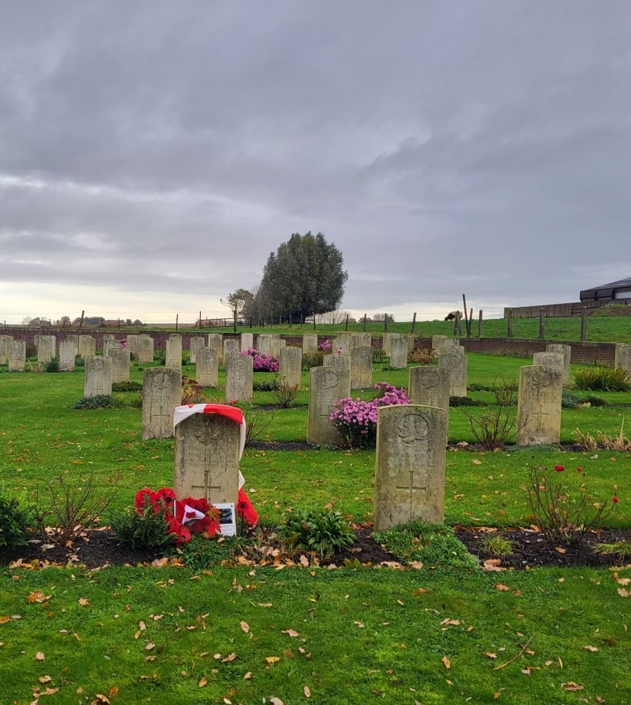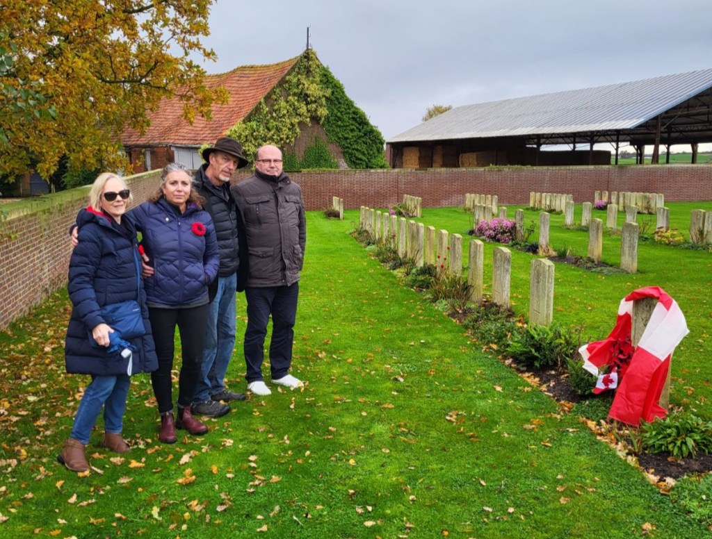 Here is where I come to the story of how my travel plans changed. Earlier this year a police officer reached out to me from Ontario. He and his pipe band were going to be in Ypres and Vimy and they wanted to do a ceremony at Jim’s grave. At first, I was a little skeptical. Was this legit or some elaborate scam? Over the course of a few messages, then email, I consented to call the officer, Special Constable John Guy of the Halton Regional Police Services. He had read my book a few years ago, and Jim’s story affected him deeply. He and his family had been to Belgium in 2023 and visited Jim’s grave. When he knew his pipe band was to go to Europe, he immediately reached out to me to see if I was okay with the idea – heck, yes! It was then he met with the rest of the band members, got permission from his Chief and it all fell into place. The entire band got copies of Somewhere in Flanders so they could “meet” Jim as well, and I made my travel plans to meet them there. It was all SO much more than I had anticipated. The entire band paraded down the lane that Jim would have been carried to his final resting place. They had a piper, a singer, a bugler, speeches and a wreath laying. It was emotional, beautiful, a loving tribute to Jim and his fallen comrades at RE Farm. It will be one of my most treasured moment!