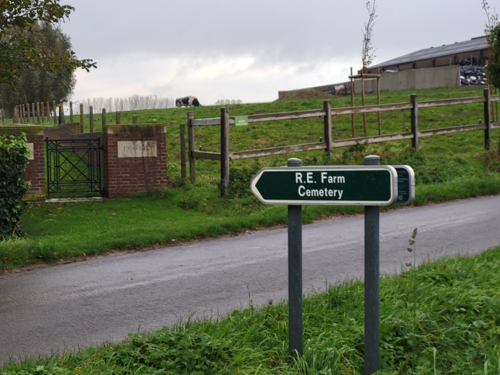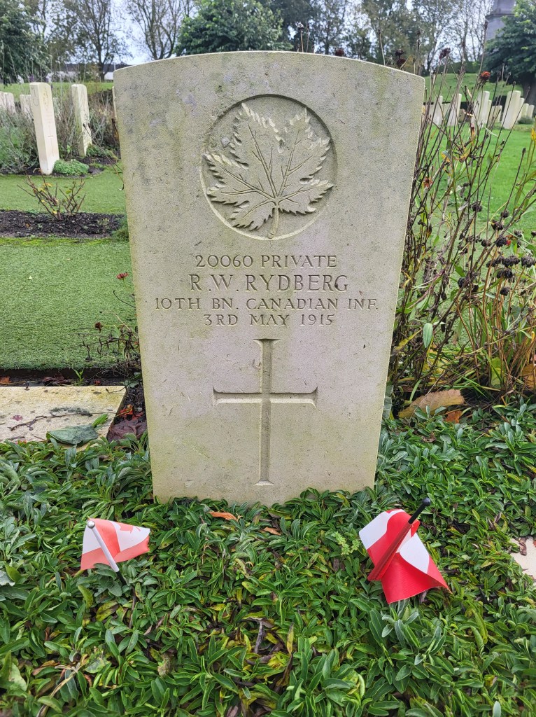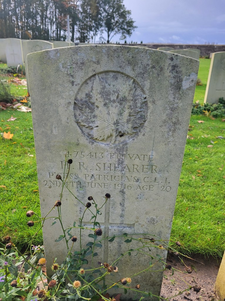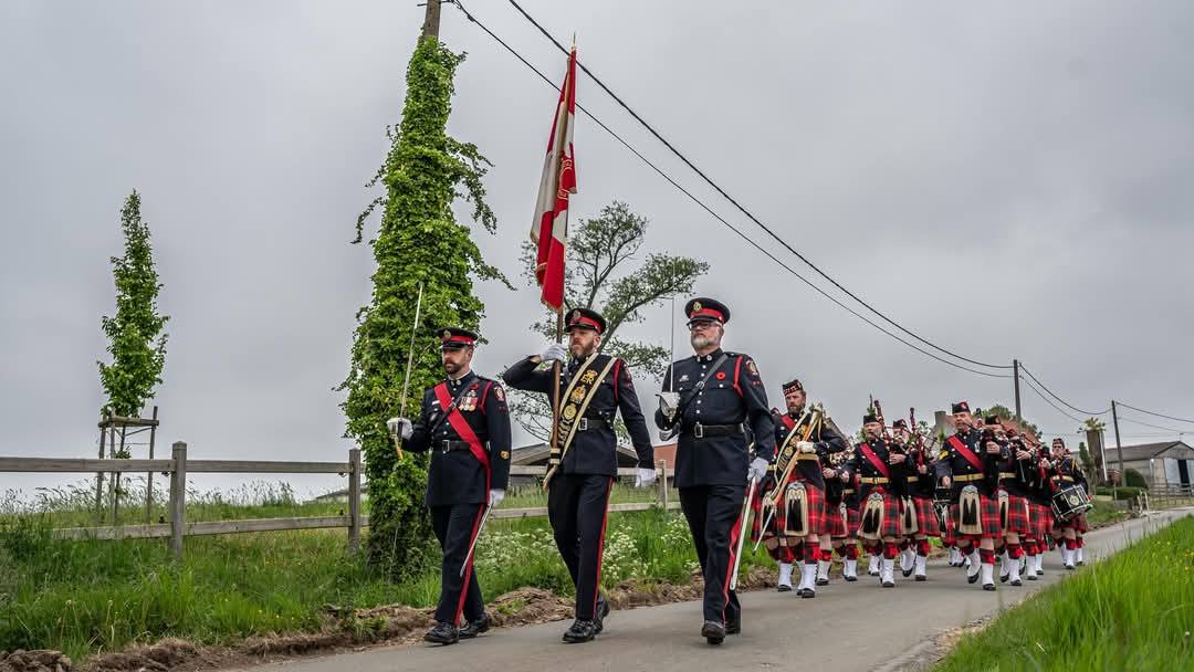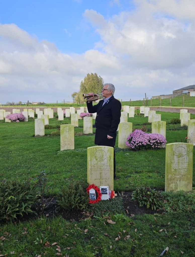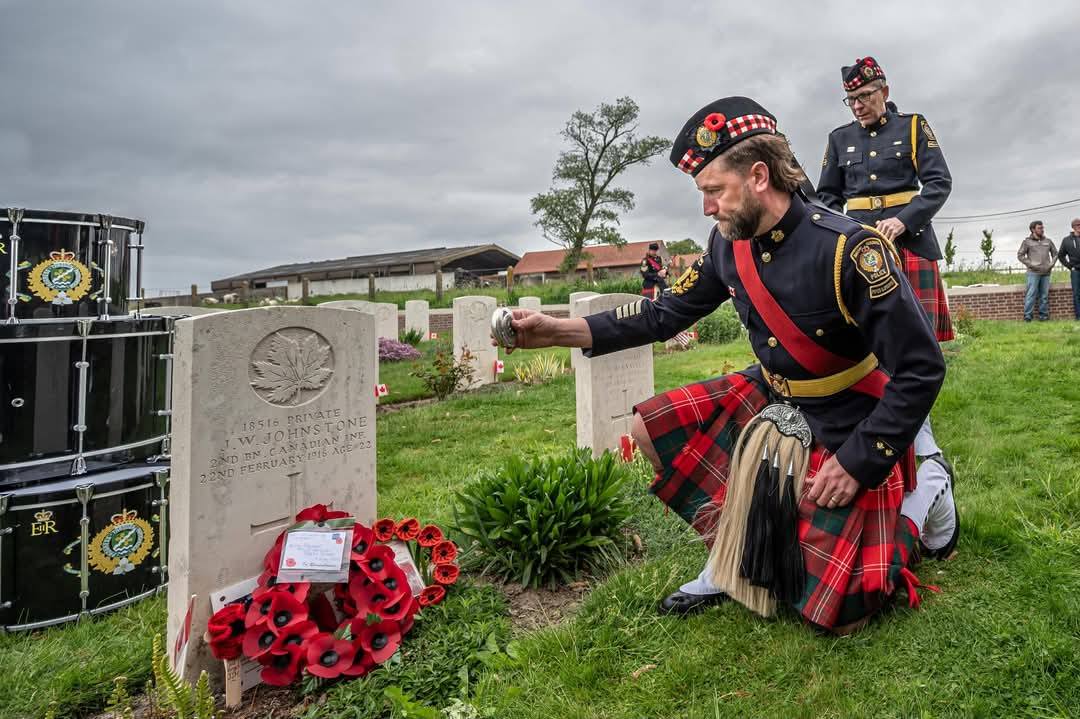 Here is where I come to the story of how my travel plans changed. Earlier this year a police officer reached out to me from Ontario. He and his pipe band were going to be in Ypres and Vimy and they wanted to do a ceremony at Jim’s grave. At first, I was a little skeptical. Was this legit or some elaborate scam? Over the course of a few messages, then email, I consented to call the officer, Special Constable John Guy of the Halton Regional Police Services. He had read my book a few years ago, and Jim’s story affected him deeply. He and his family had been to Belgium in 2023 and visited Jim’s grave. When he knew his pipe band was to go to Europe, he immediately reached out to me to see if I was okay with the idea – heck, yes! It was then he met with the rest of the band members, got permission from his Chief and it all fell into place. The entire band got copies of Somewhere in Flanders so they could “meet” Jim as well, and I made my travel plans to meet them there. It was all SO much more than I had anticipated. The entire band paraded down the lane that Jim would have been carried to his final resting place. They had a piper, a singer, a bugler, speeches and a wreath laying. It was emotional, beautiful, a loving tribute to Jim and his fallen comrades at RE Farm. It will be one of my most treasured moment!