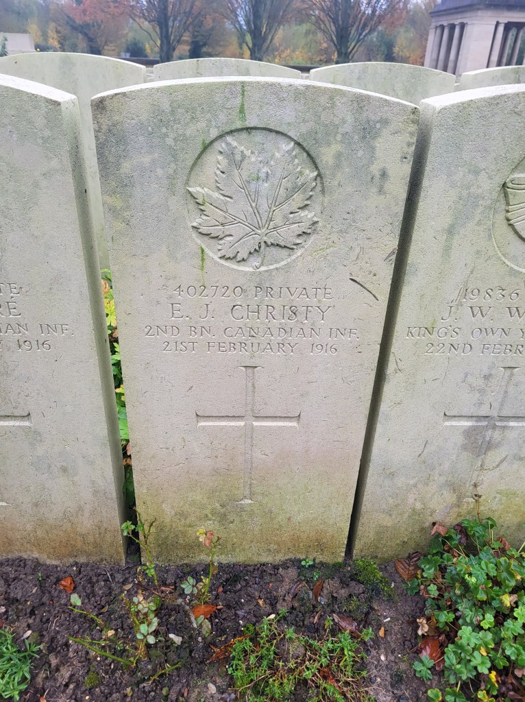 While James may have missed the “big” battles and only arrived in time for occupying the quiet lines at Ploegsteert and Messine, it doesn’t mean he was safe. On 23 October 1915, he took a bullet to the neck, and although it was deemed a “slight” wound, he spent more than a month in the No.22 General Hospital in Camiers, France, and another full month at the Base Depot recovering. No doubt he wrote his father letting him know he was fine and how lucky he was. With a brand-new wound stripe sewn on his sleeve, James returned to the 2nd on Christmas Day 1915. On 1 February 1916, James was granted nine days leave. Considering that some who’d been in the line since March only got leave in January, he was very fortunate. Likely he headed to London for some sight-seeing, good food and fun. The 21st of February was Jim’s Nova Scotia-snow day, the huge flakes melting as fast as they hit the ground. It was “very quiet.” Again, there was nothing of note, except that is a small personal tragedy; James was not so lucky and was killed “in action”. Not much action, it seems. He lies in plot III.C.13