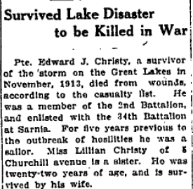 Private John Clark is one of those disappointing cases where I cannot find much information and no photo. His family is a mystery; I can’t find any siblings, and having enlisted at only 18 years old (although he was assessed at being 19), he left no wife or children to mark his place in existence. He was born to Charles and Mary Clark on 26 November 1896 in Ridgetown Ontario, and in 1915 was living in Fraserburg, Muskoka, Ontario. Still a rural area, north of Toronto, Fraserburg is now part of Ontario’s “cottage country” where thousands of people flock to escape the hustle of city life. Then, the Clark family was busy running a farm. While not a big man at 5’ 7”, brown-haired, blue-eyed John was strong and muscled from hard work.