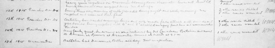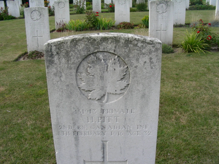 Harry was born on 9 April 1883, to George and Caroline Pitt of 18 Wallace Rd, Victoria Park, London. In 1909, as a 26-year-old, he emigrated to Canada, arriving on the Empress of Britain in Quebec in October. By1915, when he enlisted, he was farming in the Niagara region of Ontario, a warm and richly fertile area known for agriculture (now especially growing grapes for its wine industry). Harry joined the 58th Battalion on 30 June 1915 and on 17 August 1915, was on his way home to England on the S.S. Hesperian (which would be torpedoed and sunk a month later). His father was dead by then, but I must hope he was able to visit his mother. Harry was immediately placed in No. 3 Company of the 12th Reserve Battalion on 26 August and spent the next three and a half months training. On 13 December 1915, he finally was transferred to the 2nd Battalion and joined the unit in the trenches near Wulverghem a day later.