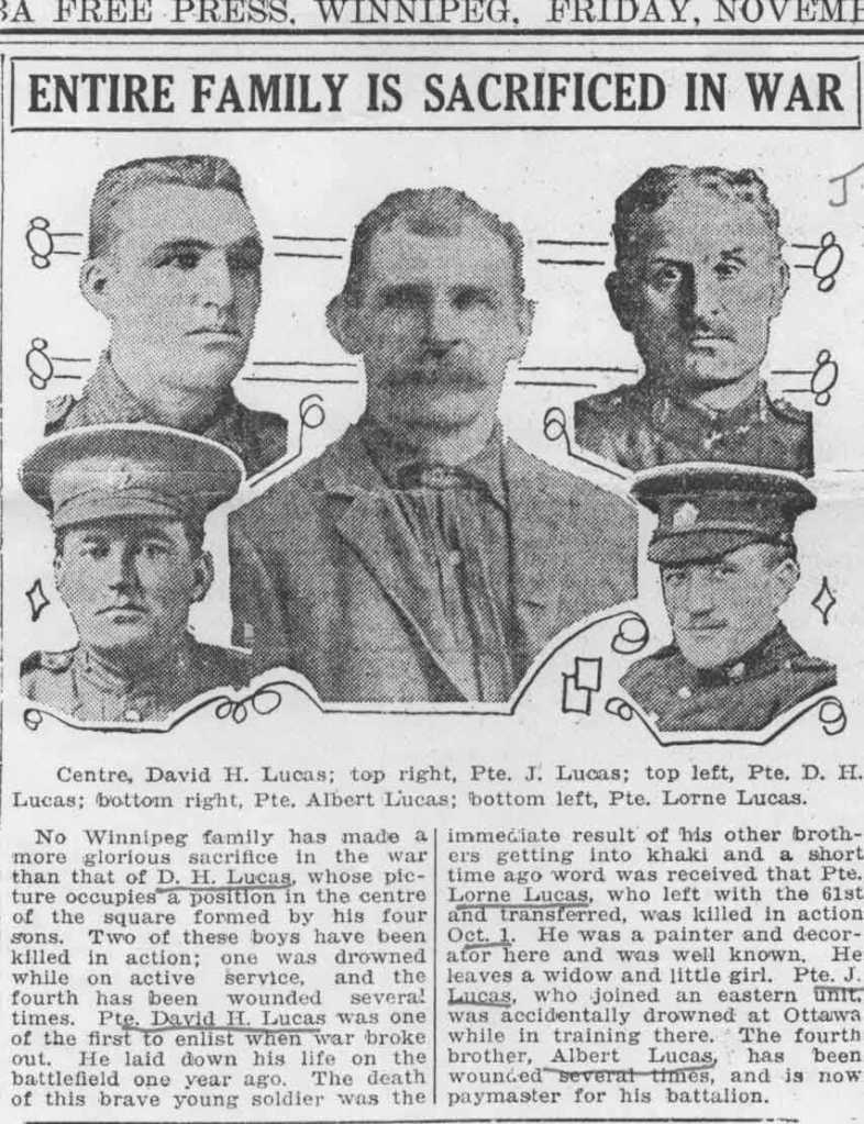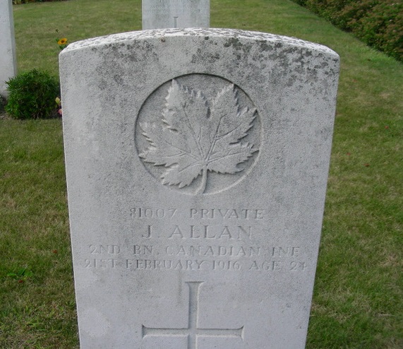 Private James Allan was another farmer, this time from out on the prairies in Manitoba. James came from a large family. His father, John, had emigrated from Scotland with his first wife, Elizabeth Robertson and their four sons, Alexander, Peter, John and James (Jim). Sadly, Elizabeth and her newborn daughter, also called Elizabeth, both died in 1882, along with 2-year-old Jim. Life was cruel then. John remarried Ann Reid Howie a year later, and welcomed Andrew, Mary, Helen, Isabella, (our) James, Martha and William, but was once again left a widower in 1900, when James was 8 years old.