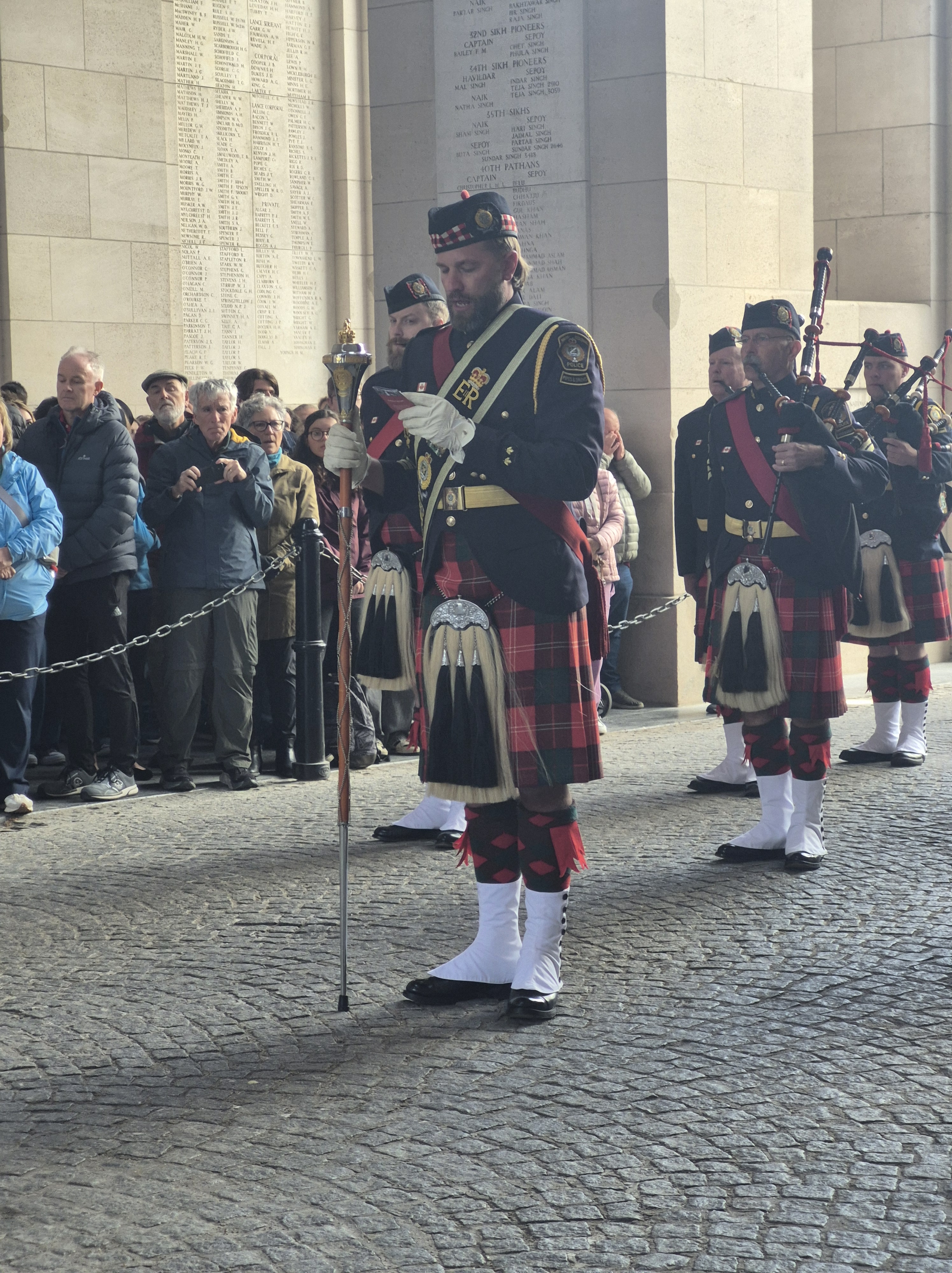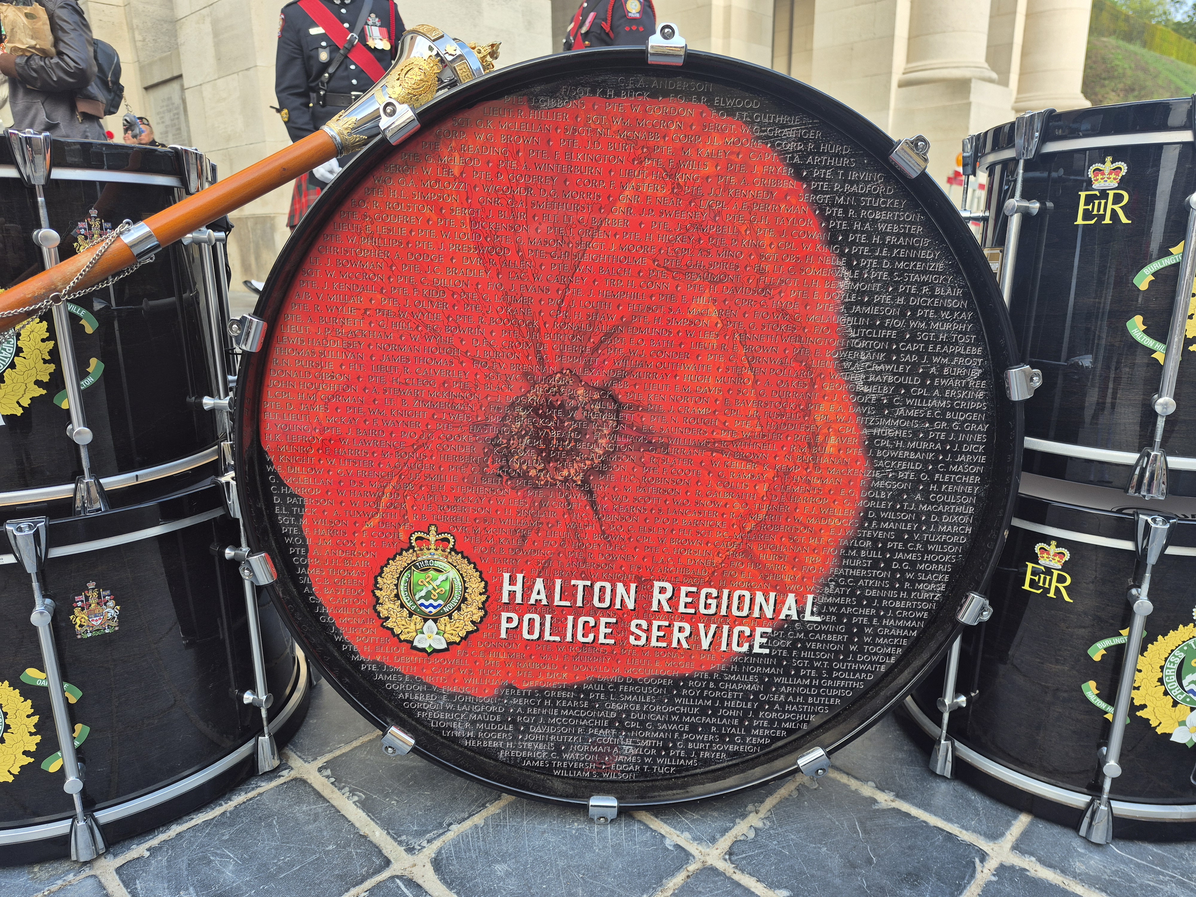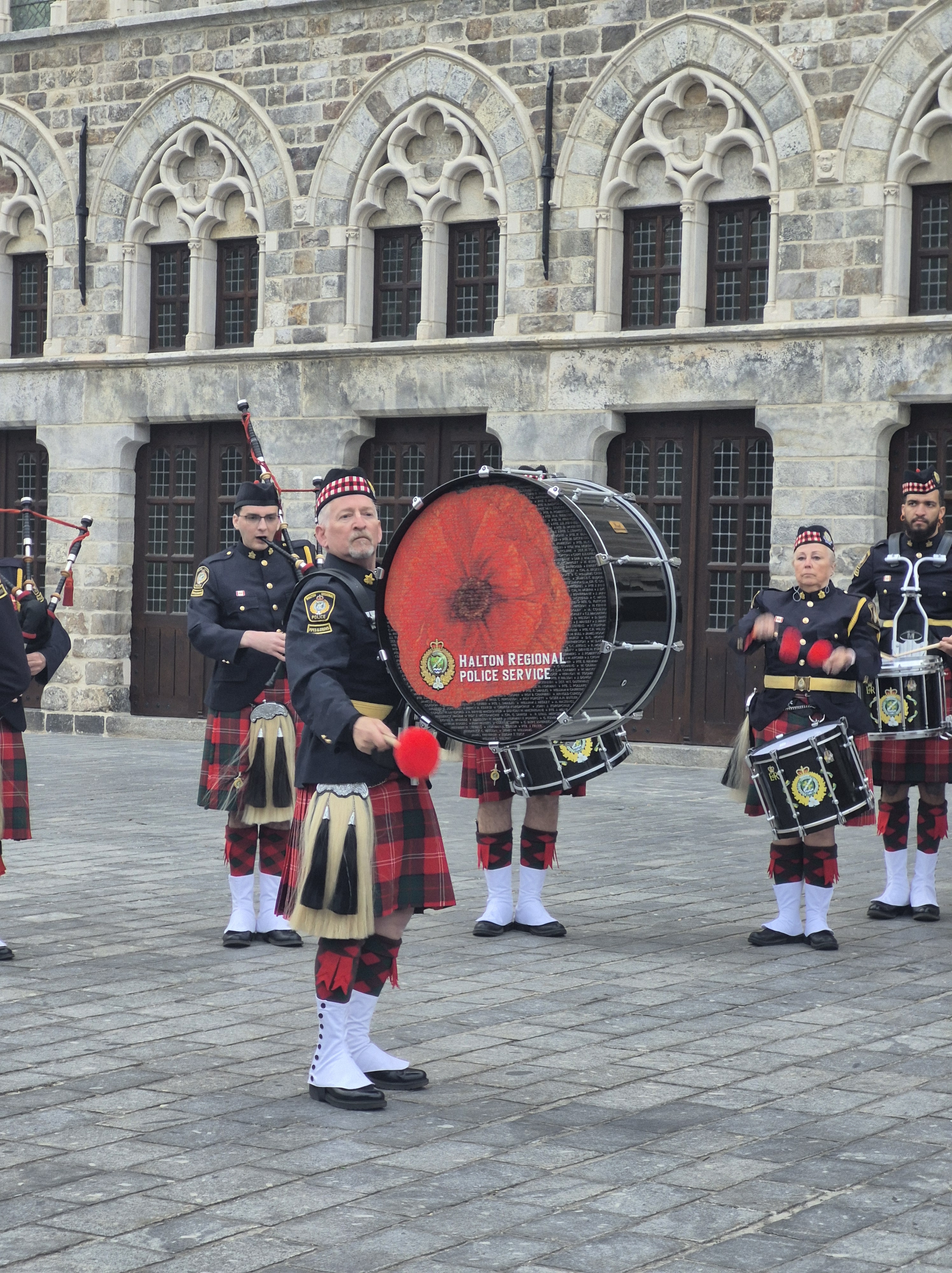 The day ended with the Menin Gate ceremony at which the Halton regional Police Services pipe and drum band played. Their drum lists all the fallen of both world wars from the Halton Region of Ontario, Canada. They had been at the VE ceremonies in the Netherlands earlier, and came to Ypres and Vimy.