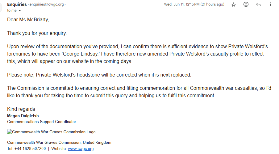 I want to give a huge shout out to the Commonwealth War Graves Commission in their incredible work and dedication to the war dead of both world wars. They are tireless in their care of the graves and the memories of the fallen. Their work is never ending, identifying remains of soldiers found during road repairs and building jobs, identifying those buried as “Know Unto God” and unidentified for decades, and correcting errors in those already identified. This is the third time I have sent them information, this time on George Welsford, who was marked as L. Welsford on his grave in R.E. Farm. They carefully verified the information I sent them and immediately set about correcting his information. Perhaps there is no family to ever know about the error or the correction, but that never means they neglect to update headstones and on line records. The men and women of the CWGC – from the gardeners to the researchers – are unsung heroes in commemorating those who gave their tomorrow for our today.